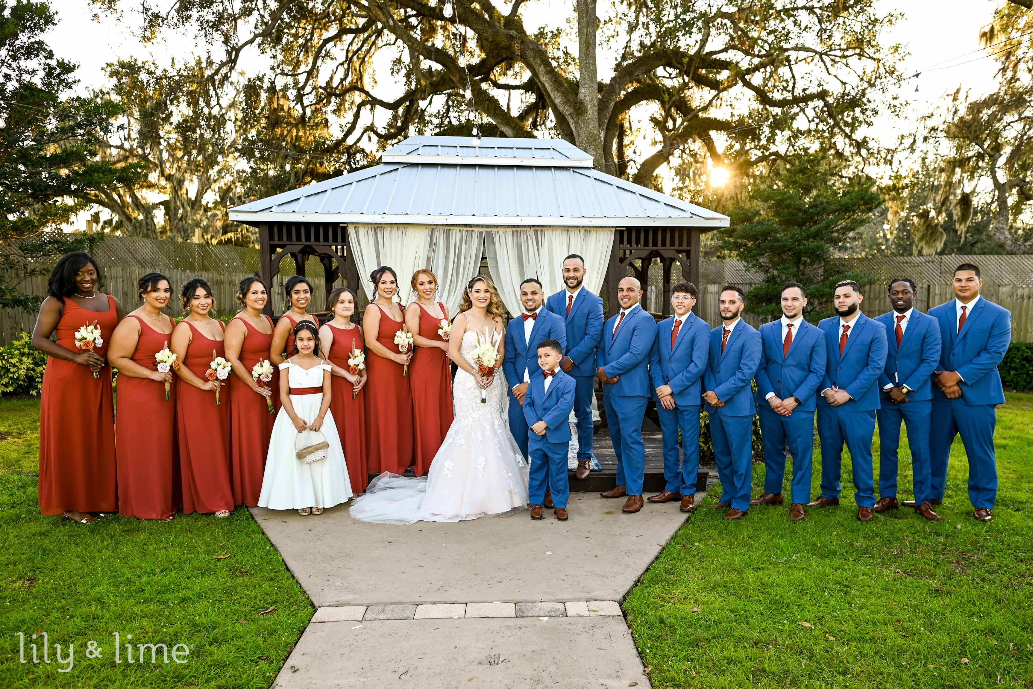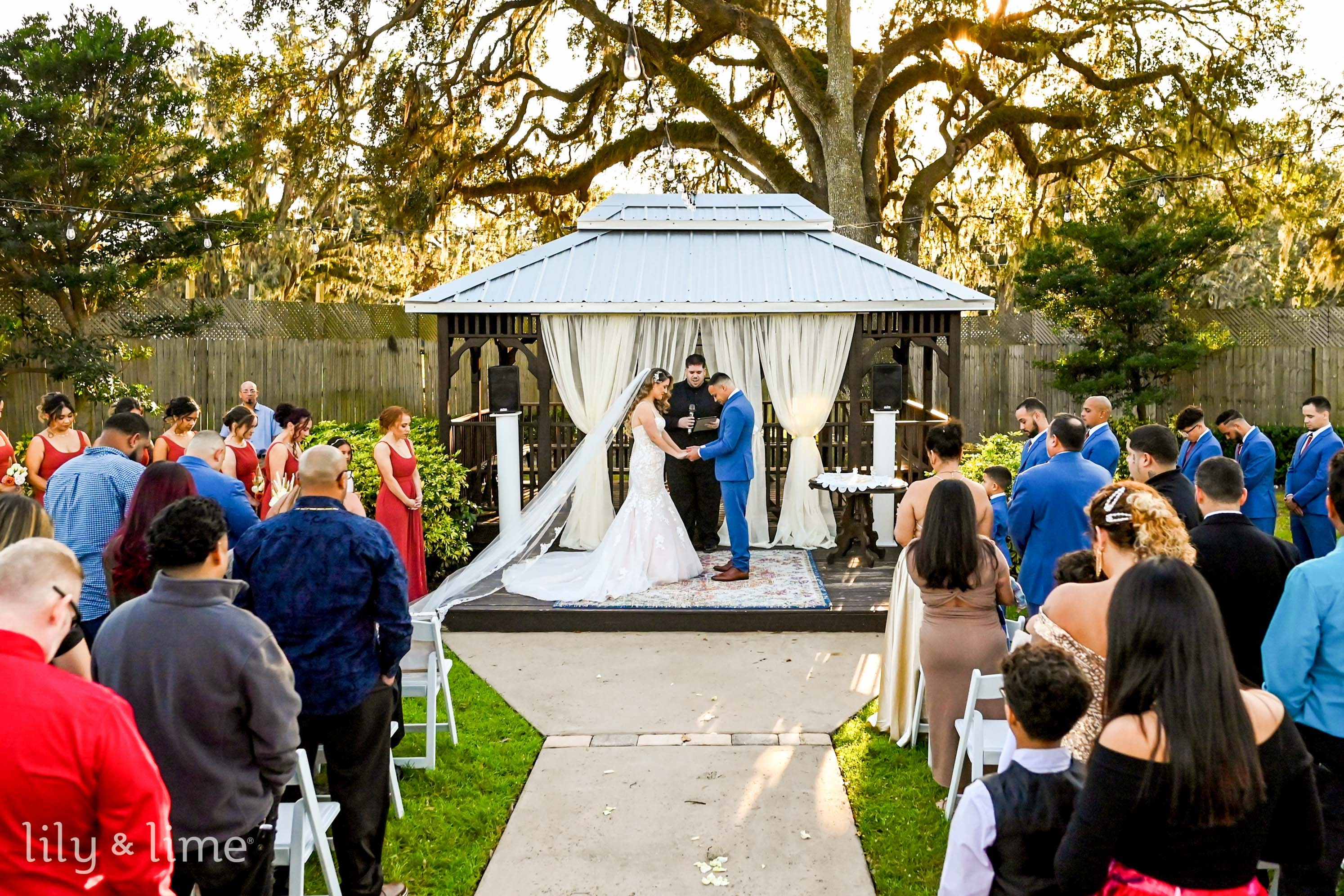 When Abigail and Kevin decided to tie the knot in Tampa, they knew it would be a unique and unforgettable winter wedding. Surrounded by their closest family and friends, the happy couple exchanged vows in a charming outdoor garden wedding ceremony setting at a beautiful wedding venue in Tampa. As they said "I do" in front of a gorgeous gazebo surrounded by lush greenery and delicate white drapes, the sun slowly began to set, casting a breathtaking golden light over the garden wedding decorations. It was a moment that captured the essence of their love and the beauty of their chosen winter wedding location!