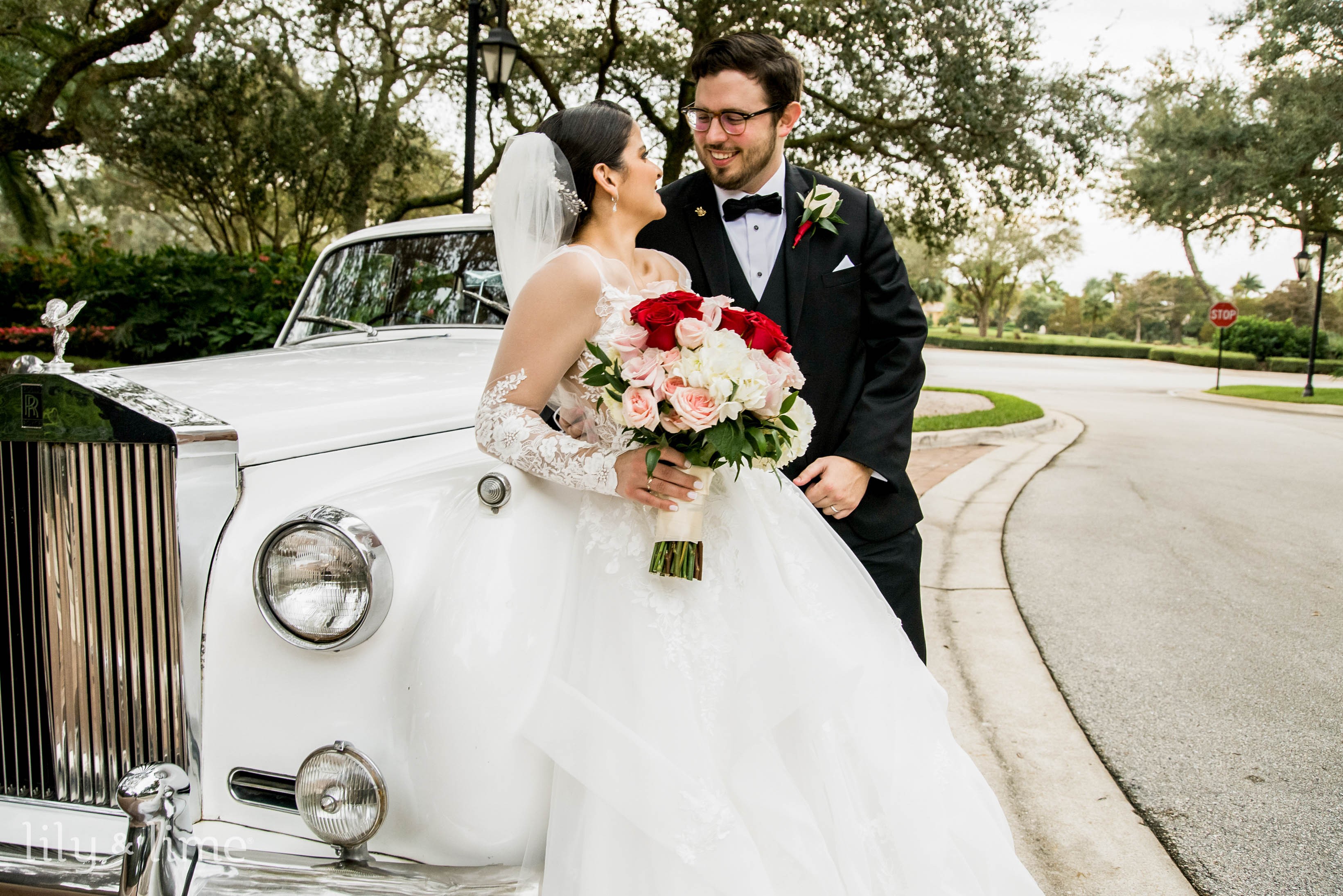 Andrea and Fernando’s wedding day dawned bright and early and the couple started getting ready for their special day. Andrea wore a white satin robe, while her bridesmaids wore red robes as they toasted to the bride's bright future and got ready for the ceremony. Soon Andrea changed into a gorgeous lace ballgown wedding dress with a cascading train. The long sleeves in lace and the veil completed her bridal look as her hair was done up in an elegant knot, adorned with sparkly hair accessories, and her make-up was classic and romantic. Andrea carried a beautiful red and blush pink rose bouquet which matched the timeless theme perfectly! Going with the theme, Fernando looked dashing in his black suit, crisp white shirt, and black bow. Andrea had a sentimental first-look session with her father, and then the couple arrived at the church along with their loved ones. The ceremony site was decorated with simple classic Christmas decor, twinkling lights, evergreen wreaths, and red bows. After the ceremony, Andrea and Fernando were captured by our Miami wedding photographers in some timeless captures. After some stunning shots by the vintage getaway car, the couple went to the wedding reception area to celebrate the event with their guests.