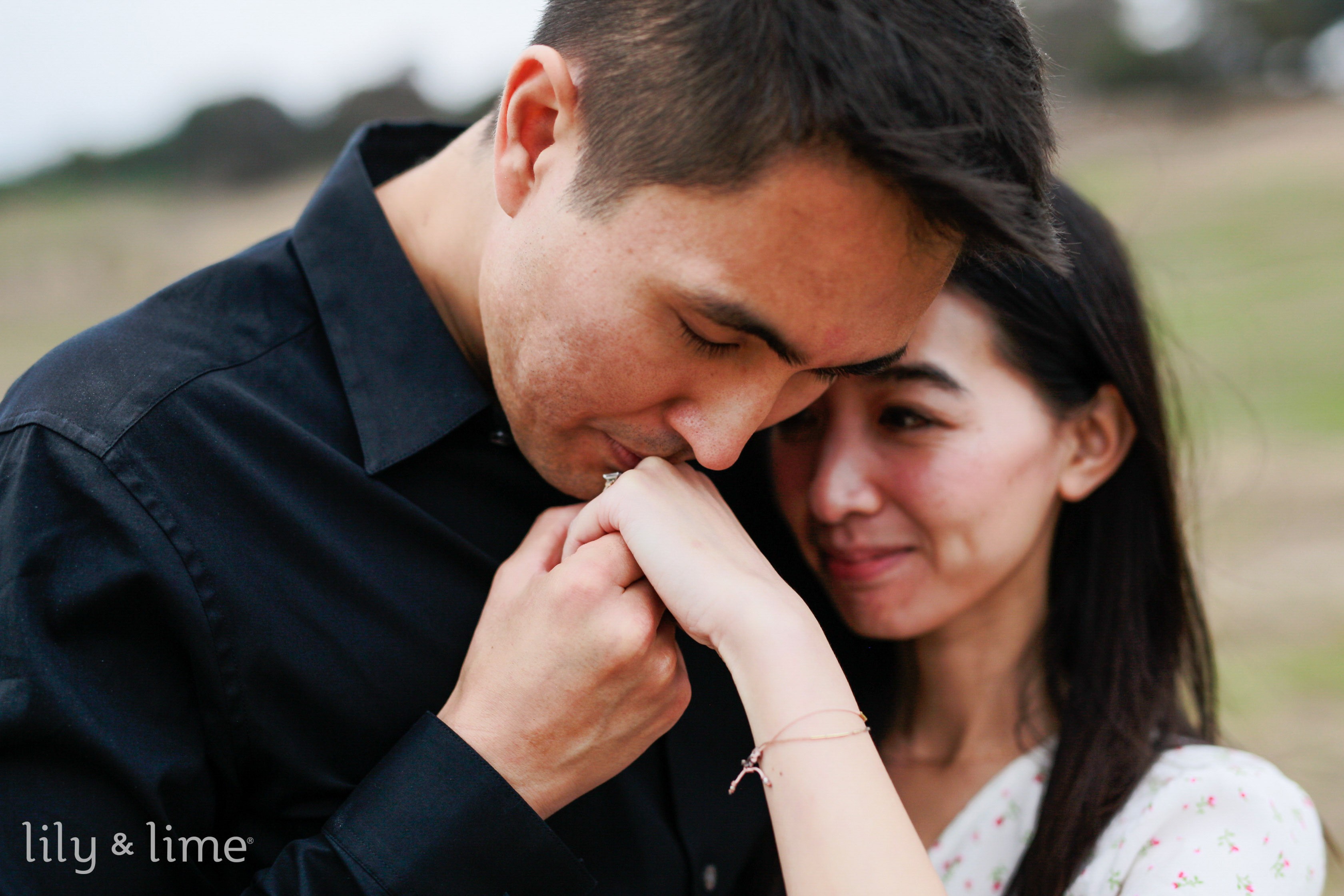 As they had some lively moments with each other, our LA engagement photographers managed to click some playful engagement shots. Angela wore a ravishing white engagement dress with a stunning v-neckline and tiny red motifs. The tea-length engagement dress revealed a gorgeous brown bridal sandal with straps. She kept her hair open for a more carefree and effortless engagement bridal look. Our dashing would-be groom Ryan wore a casual black solid full-sleeve shirt with matching black pants, a black belt, and a pair of black groom shoes. The casual engagement wardrobe looked fabulous for this beautiful engagement location in LA!