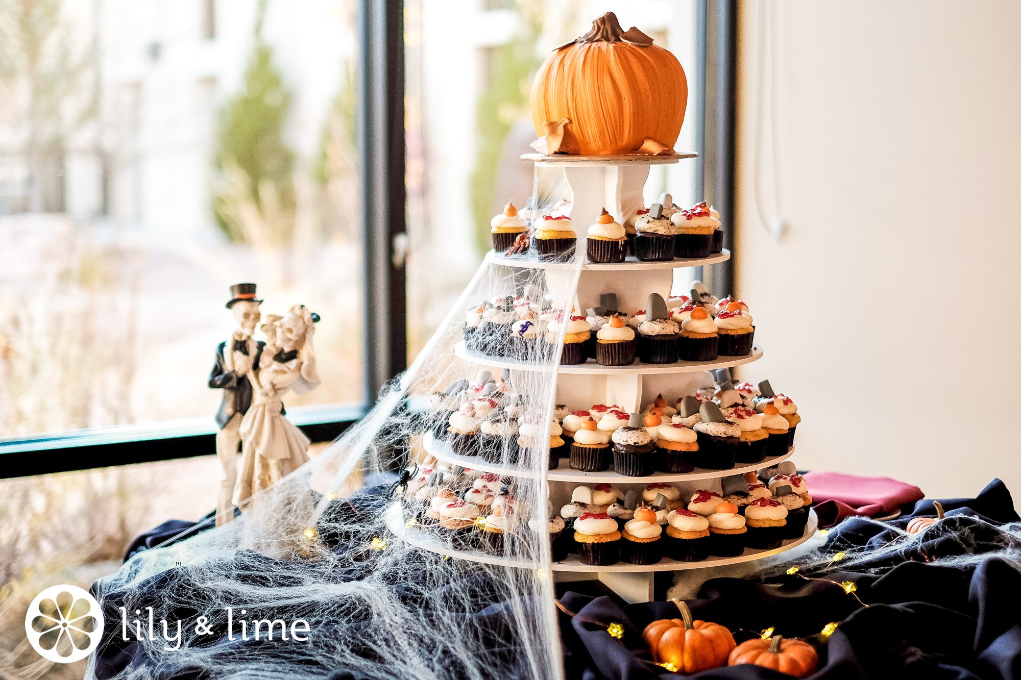 Decorating the table with leaves can be an easy way to add dramatic effect to your dessert station. For autumnal flair, add real or sugar leaves to your wedding cake. Cupcakes can be topped with tiny candy pumpkins, too. If you’re wedding is near Halloween, add some spooky elements to your dessert table - like a fake spiderweb!