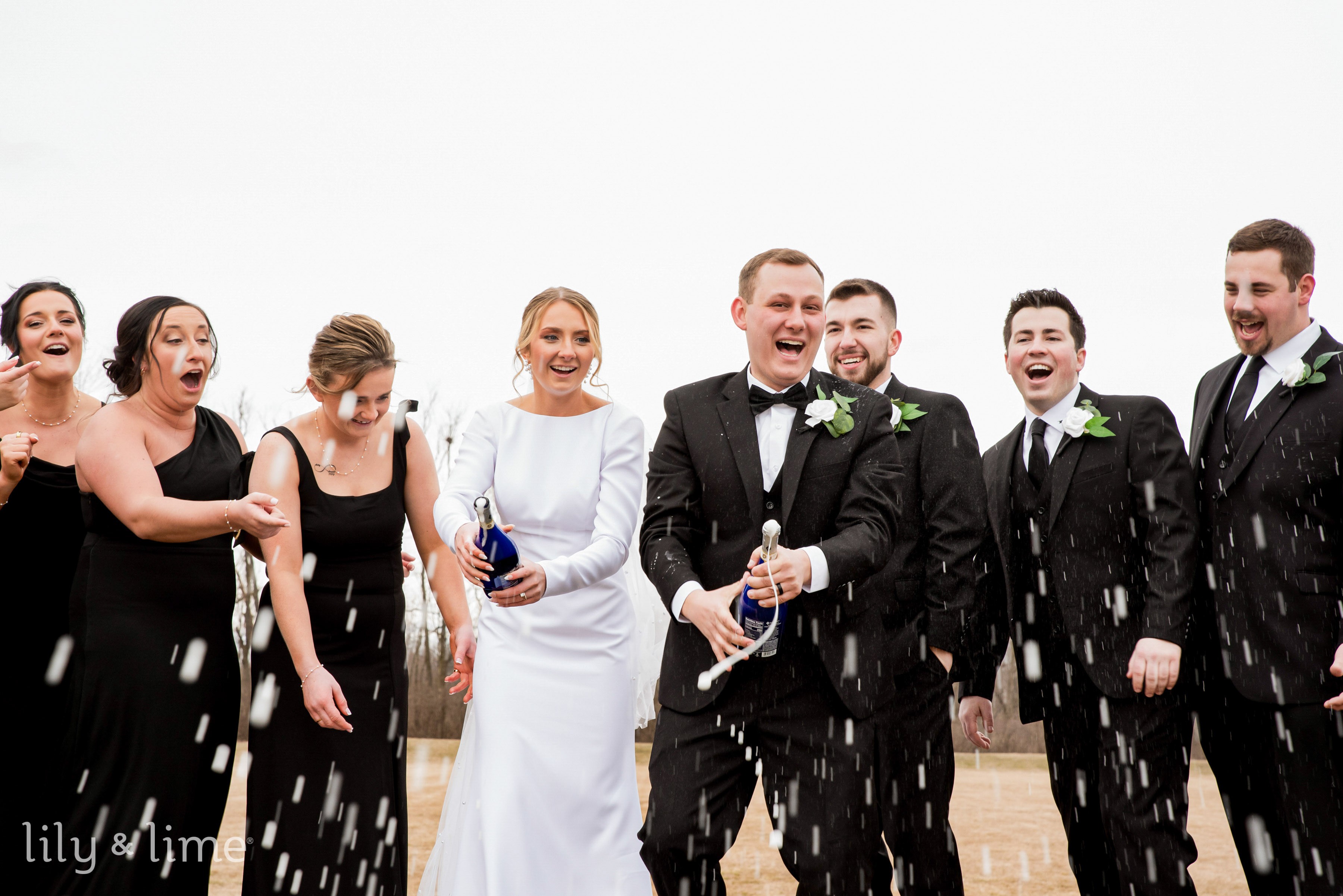 The wedding party was equally well-coordinated; the bridesmaids dazzled in matching black dresses, each carrying a bouquet of greenery, while the groomsmen looked sharp in their black suits. Their cohesive look set the stage for a memorable celebration.