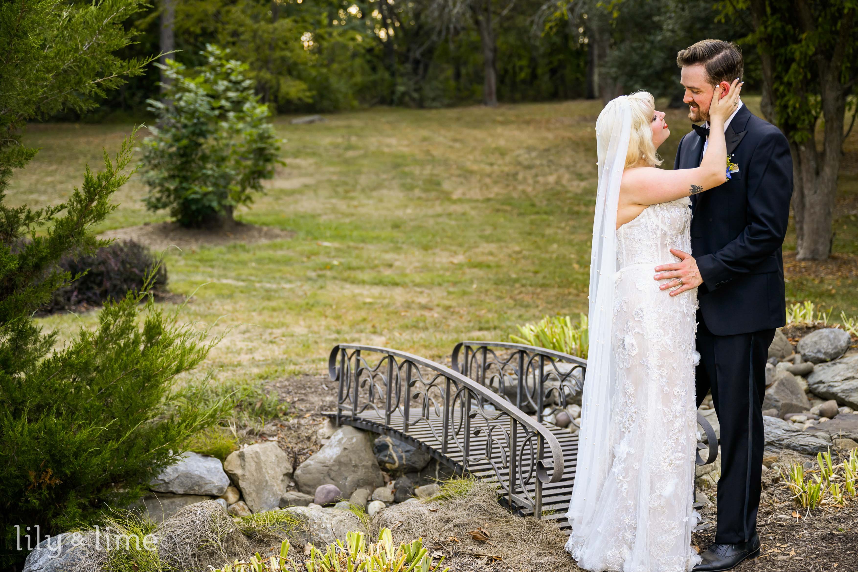 Meanwhile, the girls were getting dressed for the day. Starting their getting ready time with a short chat, they decided to get dressed quickly. The bridesmaids decided to finish dressing up first, and then they helped the bride. As the girls were getting dressed for the day, our photographer took some photos of the wedding dress. Danielle, being a stylish bride, had a short hairstyle, and had decided on a beautiful wedding dress. The bodice of the wedding dress was snatched and had a sweetheart neckline. The skirt for the dress was separate. The ensemble made her look absolutely stunning! As she put on her dress, her bridesmaids and the maid of honor decided to help her with the makeup. Almost looking like the stunning actress, Marilyn Monroe, our bride for the day had bright but elegant cherry red makeup, and paired her wedding dress with a veil! And just like that, our bride was dressed for the day! She made her way to the spot where she and Conrad were to have their first look photo session! Our photographer captured their love and sheer excitement in the first-look photos. Conrad was standing outside, on the lawn, with his back turned. Danielle gingerly walked to him and softly tapped his shoulder. Taken aback by the beauty of his soon-to-be wife, he could not keep his eyes on her. He hugged her, and he could not stop smiling! It was easy to see that the couple could not wait to start their lives together.