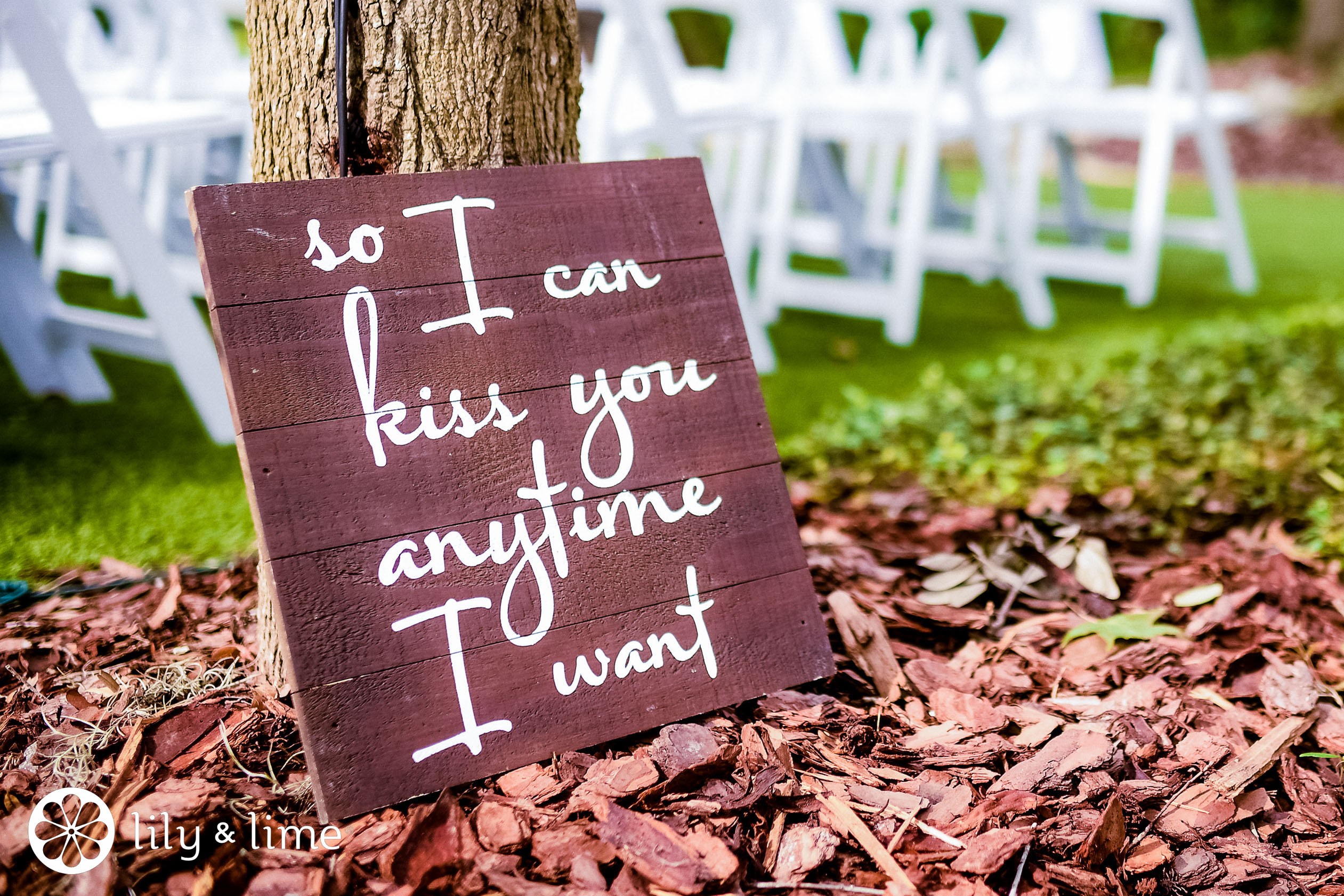 Go au naturel to match the rest of your fall-themed wedding decorations. To stand out from the crowd, all you need is a simple set of wooden plants with "Mr" and "Mrs" etched on them. Incorporate your chosen flower scheme into wreaths for the bride and groom, as well as hanging planters or bouquets for the rest of the guests, to take it up a notch. Comfort is key, especially at the ceremony. If you are tying the knot outside, make sure everyone is warm and cozy by providing a blanket on the back of each seat.