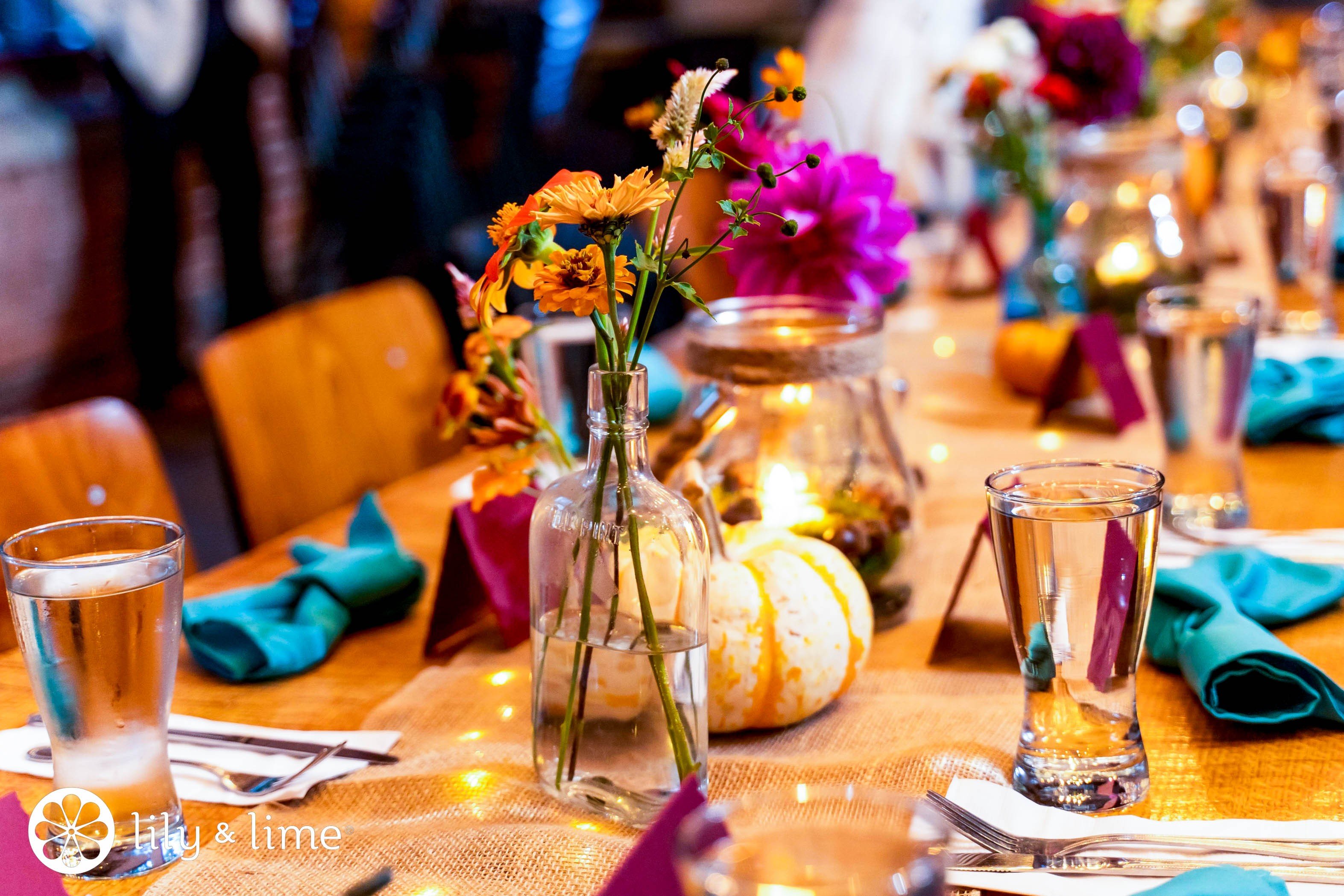 Emerald Green: This jewel-toned green, is one of the most popular fall colors and is often described as "luxurious." Emerald green can be used in a variety of color schemes, from the primary color with white and gold to an accent color with navy blue and burgundy in a rich, jewel-toned palette. Use it in a dramatic way throughout your event, or use subtle splashes in things like candle holders and ribbons.