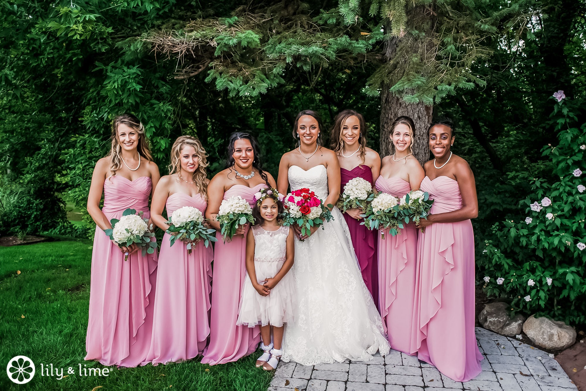 It’s a flattering color for bridesmaids to wear, too. If you don't want to go too bold, have your bridesmaids wear a shade lighter than your maid of honor (wearing fuchsia) or include the shade in your bridal bouquets, wedding décor, cakes, or accessories.