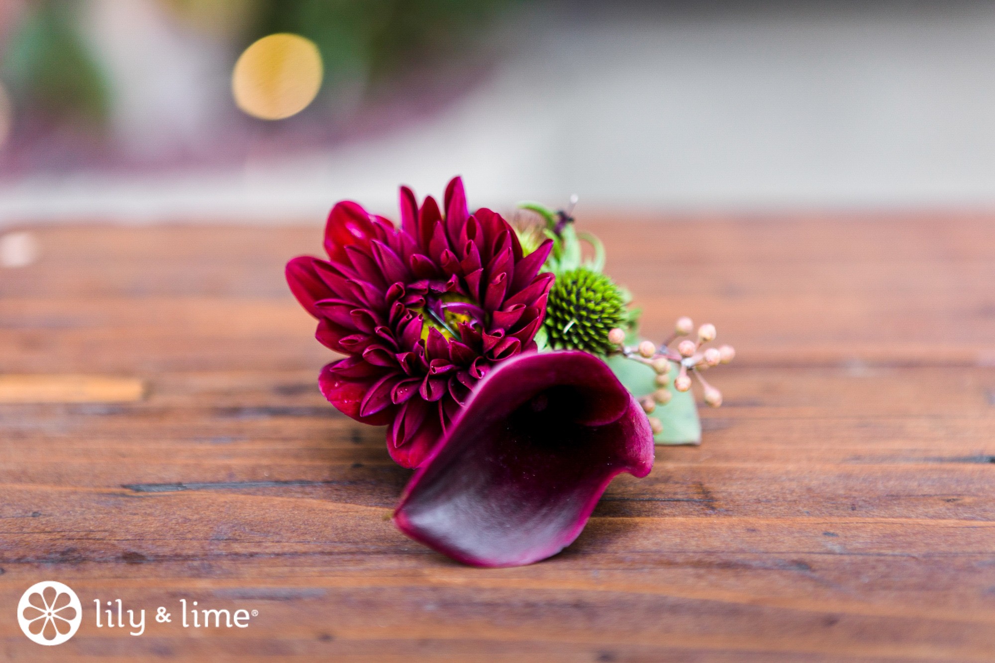 Of course, we can’t forget the boutonnieres! Boutonnieres in rich, fall colors are a great way to tie in the bridal flowers, and they add a splash to the groom and groomsmen’s distinguished attire. For an added touch, you can incorporate some fall-inspired texture for that extra flourish!
