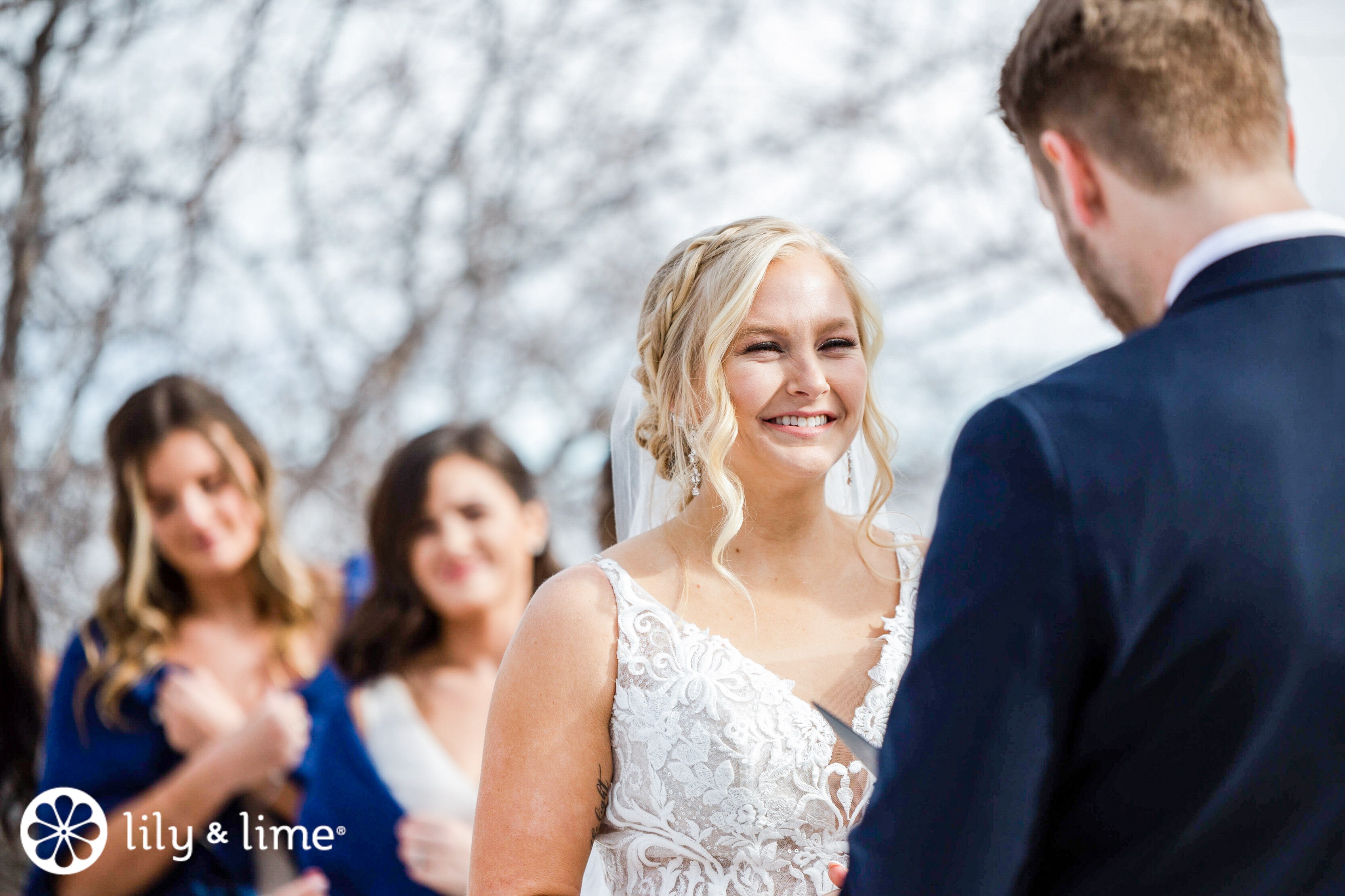 While the location brought a lot to the table, the couple brought real magic with their charming persona and vision! Devon and Bobby turned their special day into a dream! The theme for their wedding seemed perfect for the season, with white, evergreen, and blue being the main themes, with dappled hints of silver and gold for an ethereal feel. On the wedding day, our Denver wedding photographers captured some of the wedding details in lovely photos, as the duo got ready for their exciting day ahead. Devon got ready in a snow-white pajama set with black details. Soon she slipped into a gorgeous lacy trumpet-cut wedding dress, with a cascading train and veil. She had her hair in a classy bun, and he carried a floral hoop bouquet adorned with blue, cream, and green tones, and her jewelry and makeup minimal. Our bride completed her look with striped socks and ankle booties, staying warm in the cold outside. Her bridesmaid wore matching bridesmaid dresses in a champagne hue, and they all wore matching scarves in a midnight blue color, all the while carrying matching hoop bouquets!