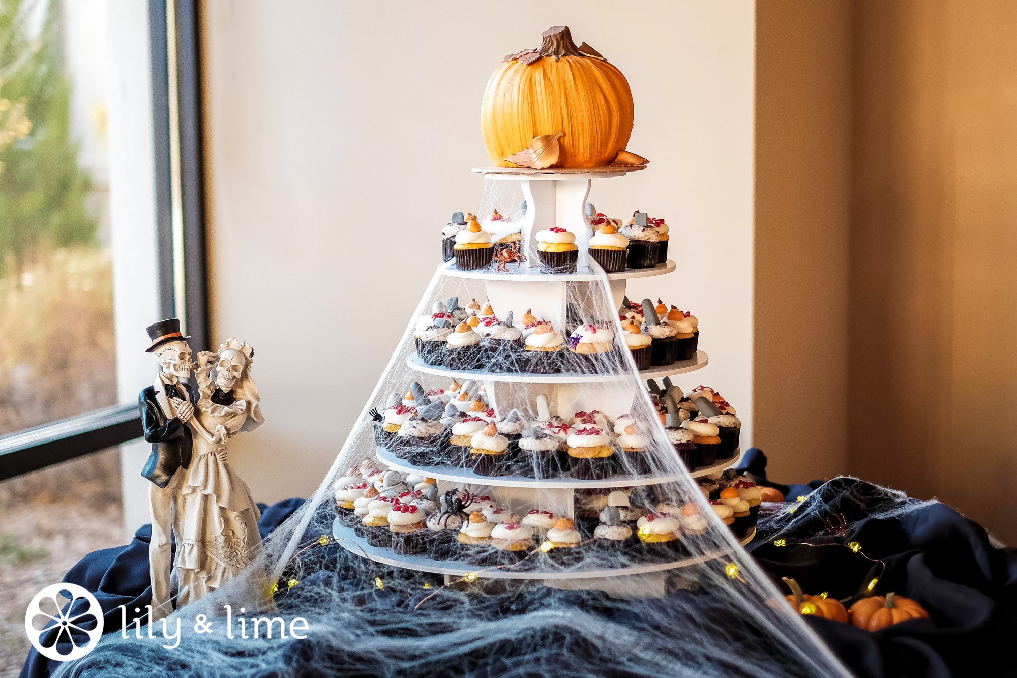 Pumpkin-inspired desserts and drinks are a tasty addition to Halloween themed weddings. You can cover your dessert table with a fake spider web and spooky decorations to add extra flair.
