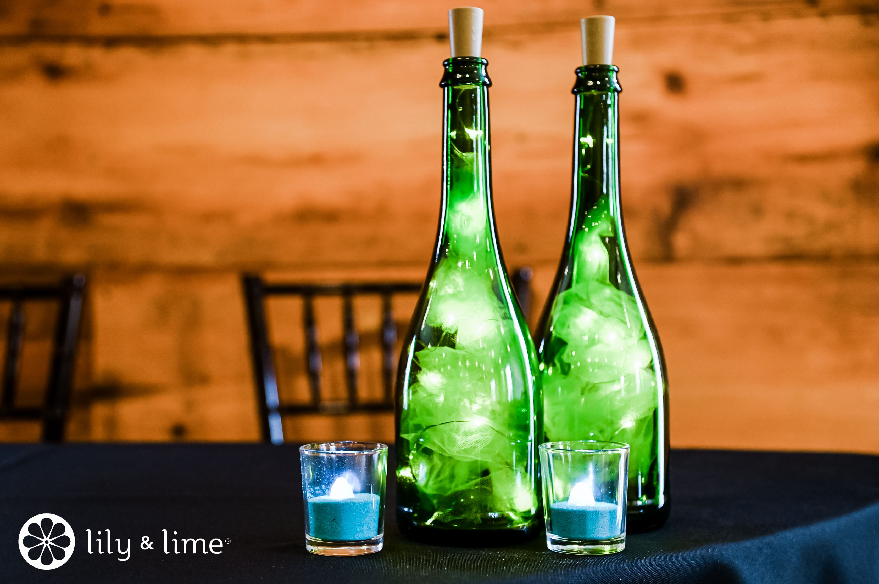 You won't have to paint some wine bottles because they come in vibrant colors. It's perfect for enthusiasts of incredible DIY wedding details. The bright wine bottles stand out against the white detail of the surrounding area and make the ideal hanging vase for your outdoor wedding ceremony. To add a touch of floral decoration, tie a bundle of baby's breath to the bottle's neck with twine.