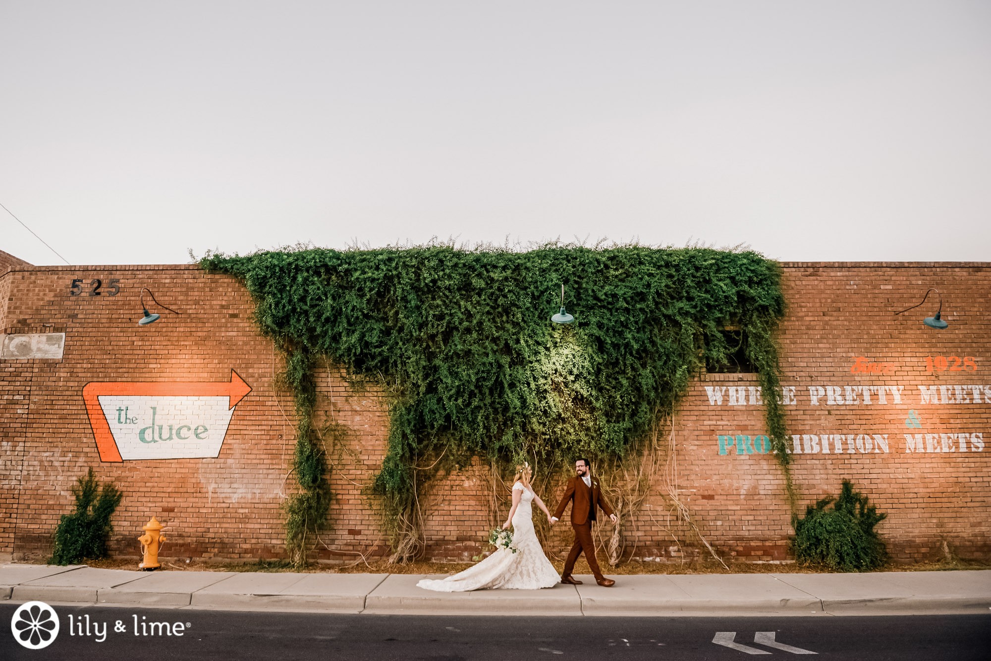 The couple came together for some fantastic portraits around the venue. We loved the neutral palette with pops of color that were brought into some photos. Whether it was the muted red of the brick outside, the orange color of the sign or the green of the picnic tables (in front of an Air Stream!), Kelsey, Ryan, and their photographer found the ideal spots for memorable photos.