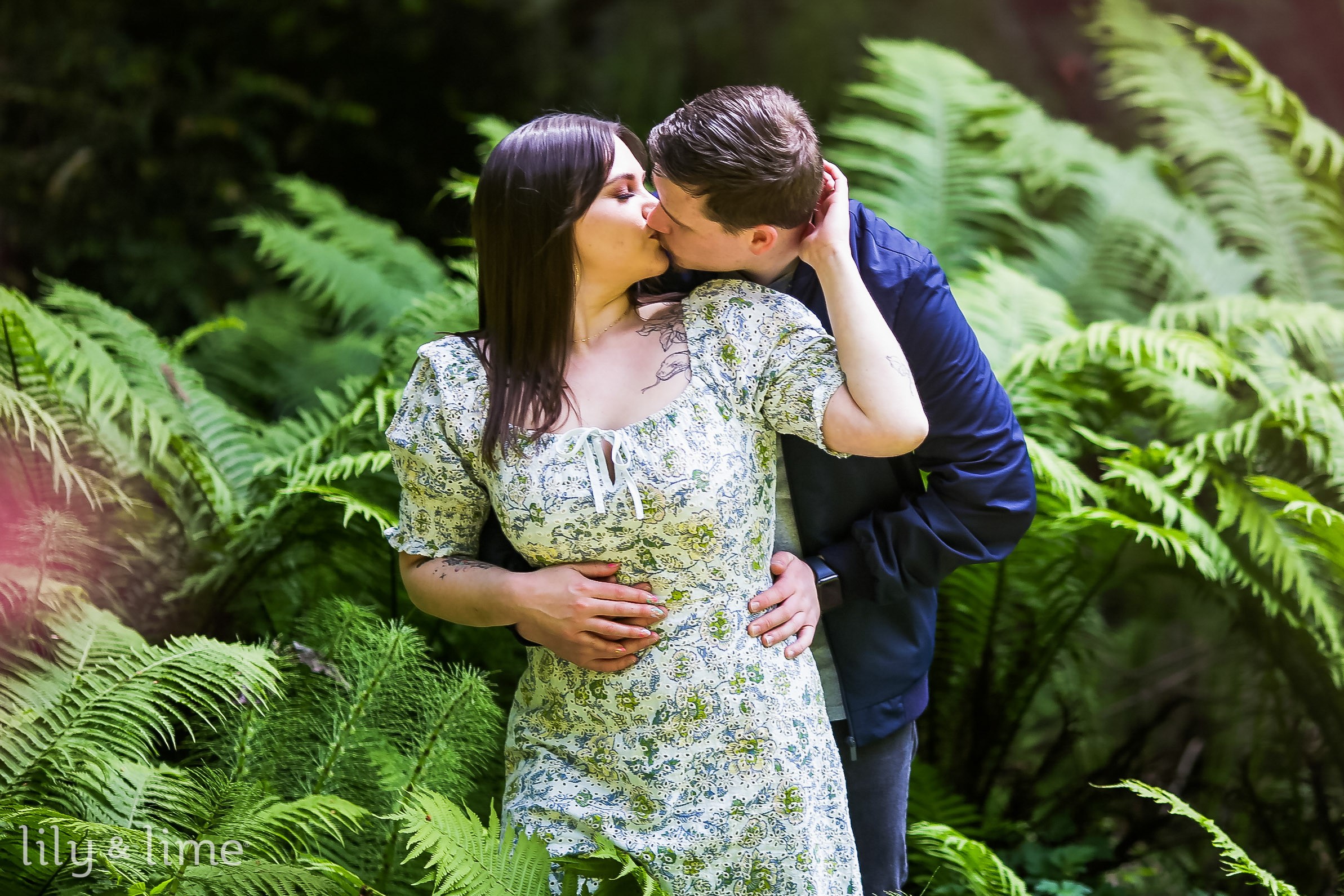 The couple then decided to change things up and walk down a tree-lined boulevard hand in hand, and our professionals captured it as the two smiled, talked, and shared a kiss or two! The tree laced the sky, and the dappled sunlight created just the perfect environment for the lovers to get lost in each other’s eyes. Soon the couple reached a gorgeous spot with gorgeous ferns and foliage, giving their photos a tropical feel. With long leaves of ferns surrounding them, the couple posed for some gorgeous shots. With knee-length grass, waterholes and surrounded in serenity, the couple truly escaped into an oasis of nature in this photo session and the photos did perfect justice to their vibe. The couple were natural and posed with such fluidity and ease, they made the entire session easy for everyone. There is a chemistry between them that is earthy, rock-solid, and calm, like still water on a warm summer day, which was beautifully captured by our Seattle engagement photographer. Overall, our skilled photographer captured the mood, the love of Kelbee and Galen, and the beauty of the location perfectly, leaving the duo with pictures that are not only gorgeous to look at, but are an escape from the blur of the mundanity with their soothing vibe!