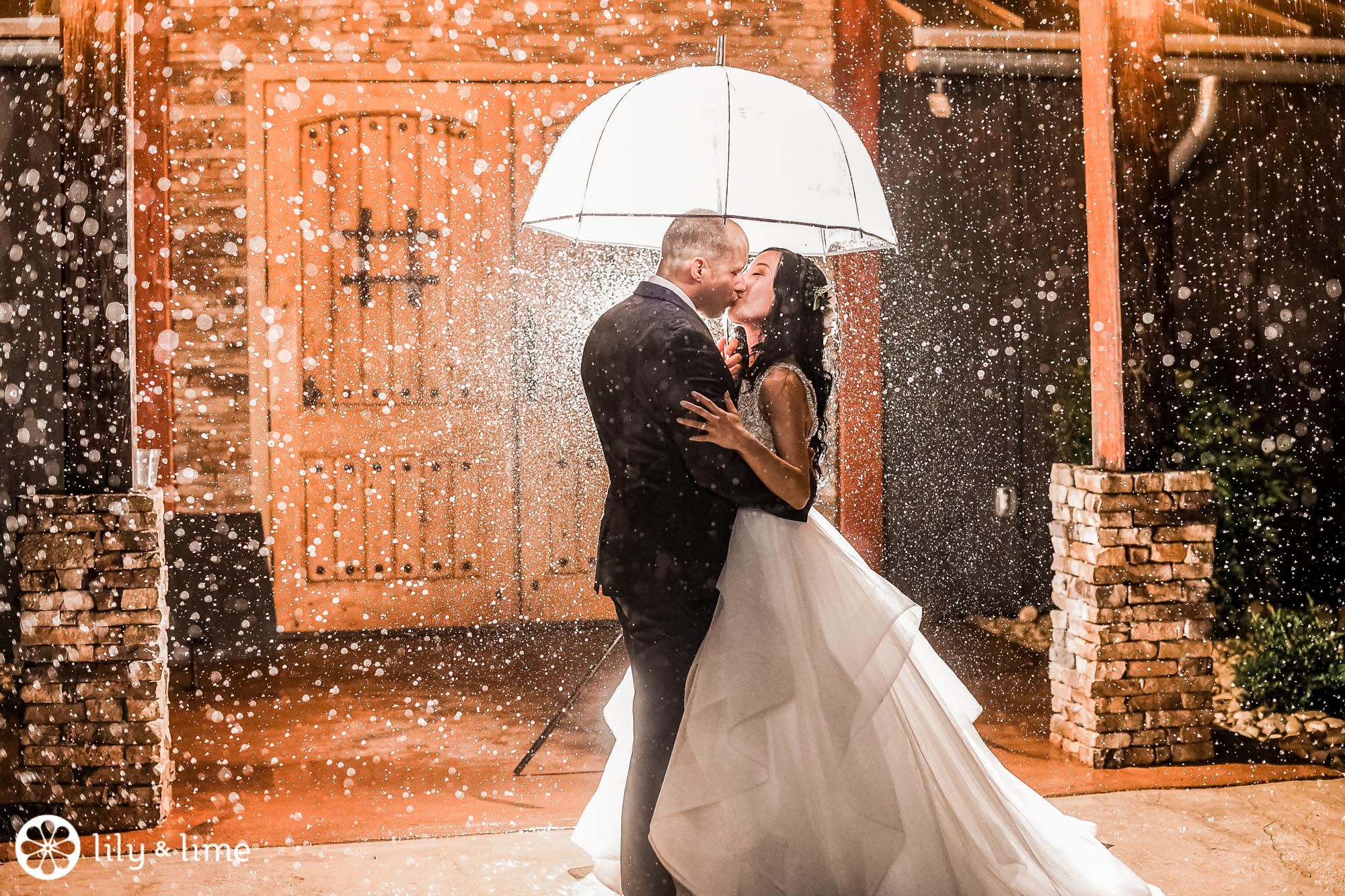 If your wedding day is graced with rainfall, grab an umbrella and embrace it. Photos using rain and light are. magical because of the way that the water reflects the light, giving you a cinematic effect.