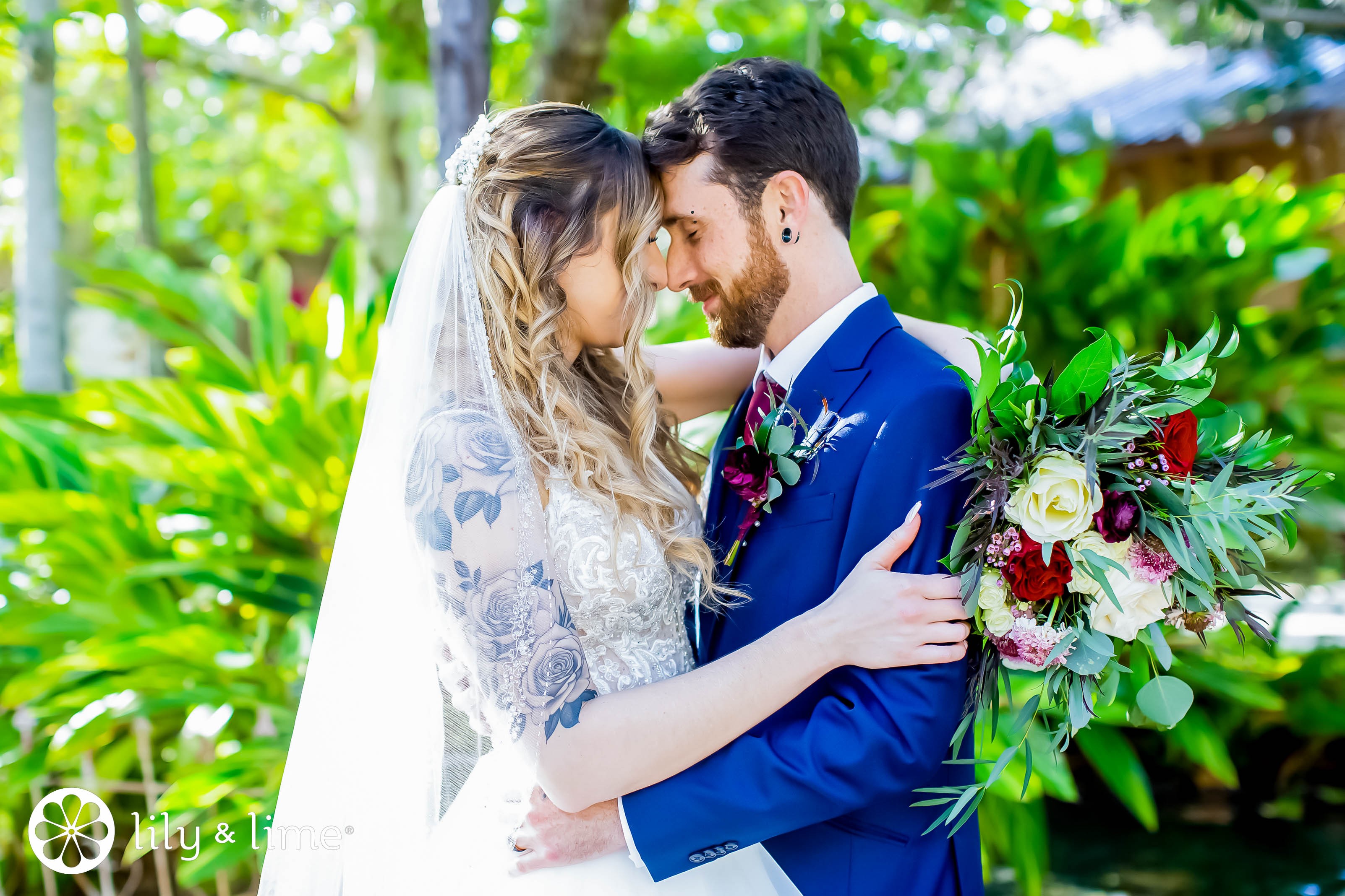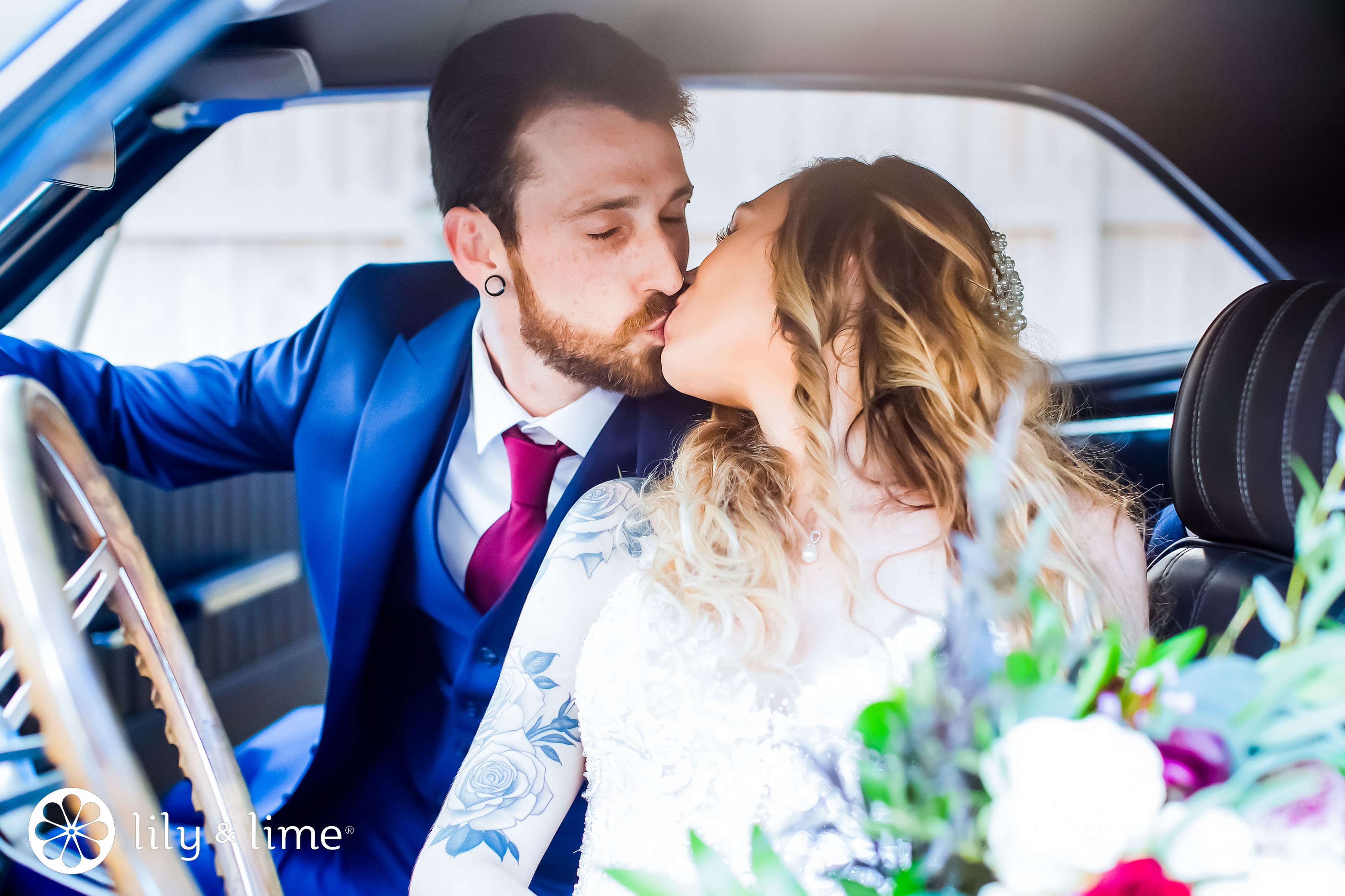 After that, the couple joined our photographer for a great post-wedding ceremony photo shoot! The two found the best spots in the venue to pose for their photos. Right before the photo shoot, Noel found a red flower that he liked and used it as a boutonniere. The venue’s barn-like architecture and natural abundance added to the photo's beauty. Finding a small walkover bridge, the two stood there, next to each other, and posed for a photo with sunlight streaming through the trees in the background. The two walked down the small bridge and snuggled closer for romantic couple photos. The two enjoyed striking different kinds of poses. Before moving on to the getaway car, Noel pulled Destiny close and slightly leaned into her. Getting the hint, Destiny lifted her bridal bouquet over her head and leaned back, as Noel held onto her. Our wedding photographer took the photo and was amazed that the couple was well-coordinated. Before leaving, Noel suggested taking a photo of their wedding bands only. The two placed their hands on the bridal bouquet and let our photographer work their charm. Walking to their wedding getaway car, the two posed for solo photos, looking happy. As Noel got into the passenger seat and Destiny took the wheel of the blue vintage car Noel cracked a joke making Destiny laugh. Then he leaned in and stole a kiss, giving our photographer a great photo of the couple!