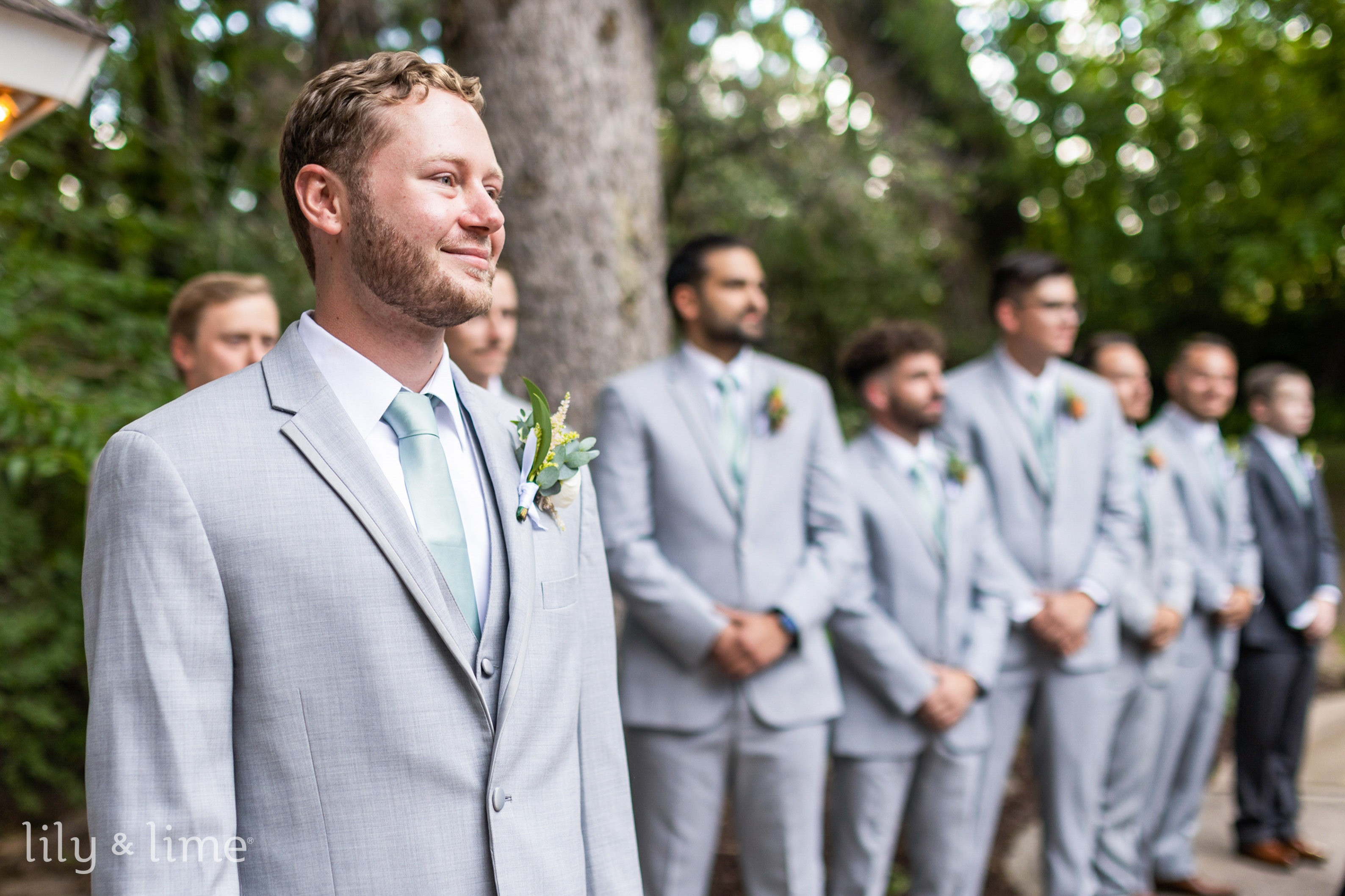Our handsome groom, Tyler, sported a dapper summer groom suit featuring a slate gray three-piece suit accented by a matching satin tie and a crisp white shirt. His sophisticated summer groom ensemble was completed with a white rose and yellow boutonniere and a pair of polished brown formal groom shoes. The groomsmen followed suit, impeccably dressed in matching outfits that mirrored Tyler's attire. They also wore slate gray formal groomsmen suits, adorned with rose boutonnieres and matching powder blue ties. The entire wedding party was ready to create unforgettable moments and that was evident in their captivating wedding portraits!