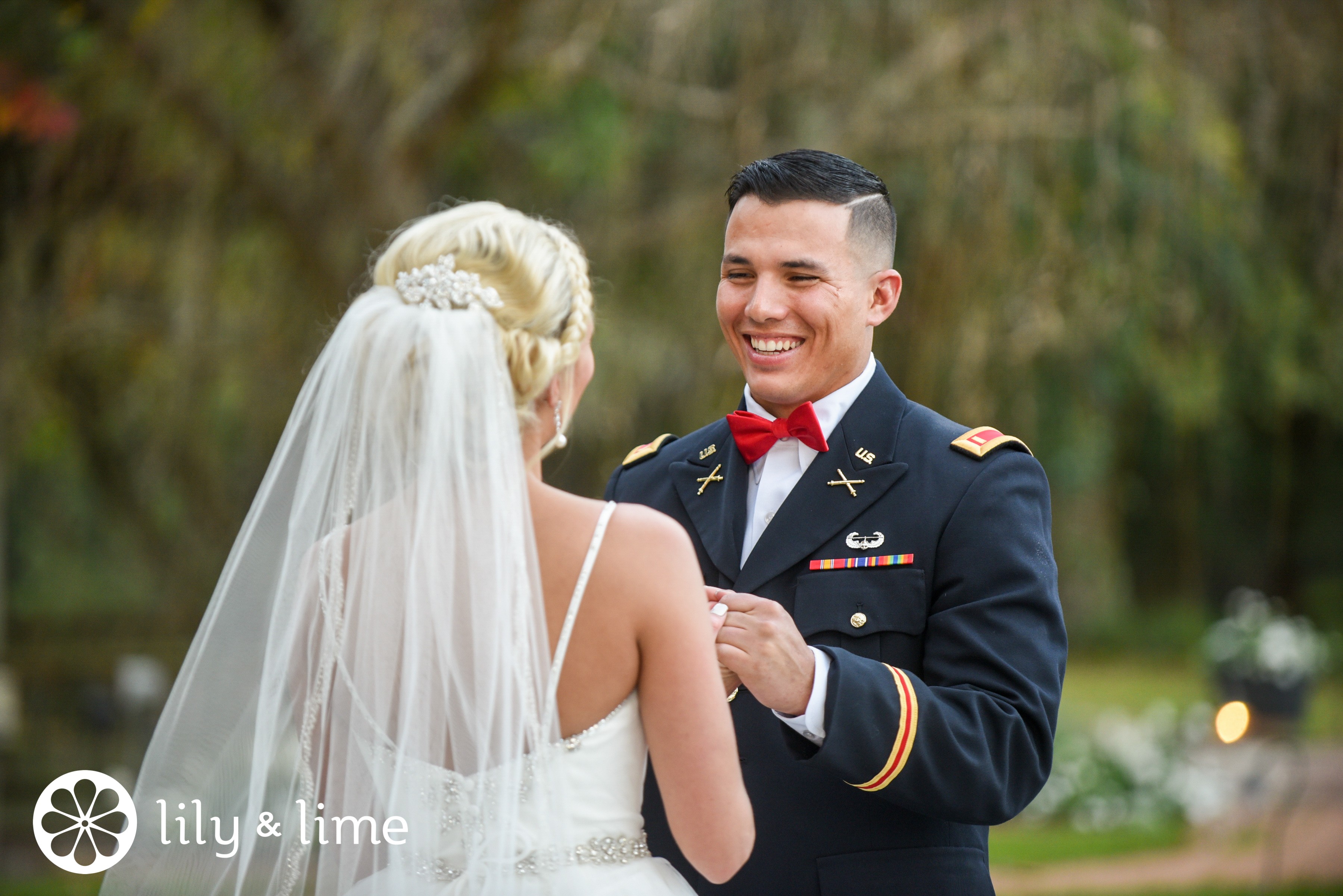 Soft white flowers beautifully complement the gorgeous blue and lace of these ladies’ dresses! Not to mention the handsome Marine in his dress blues!