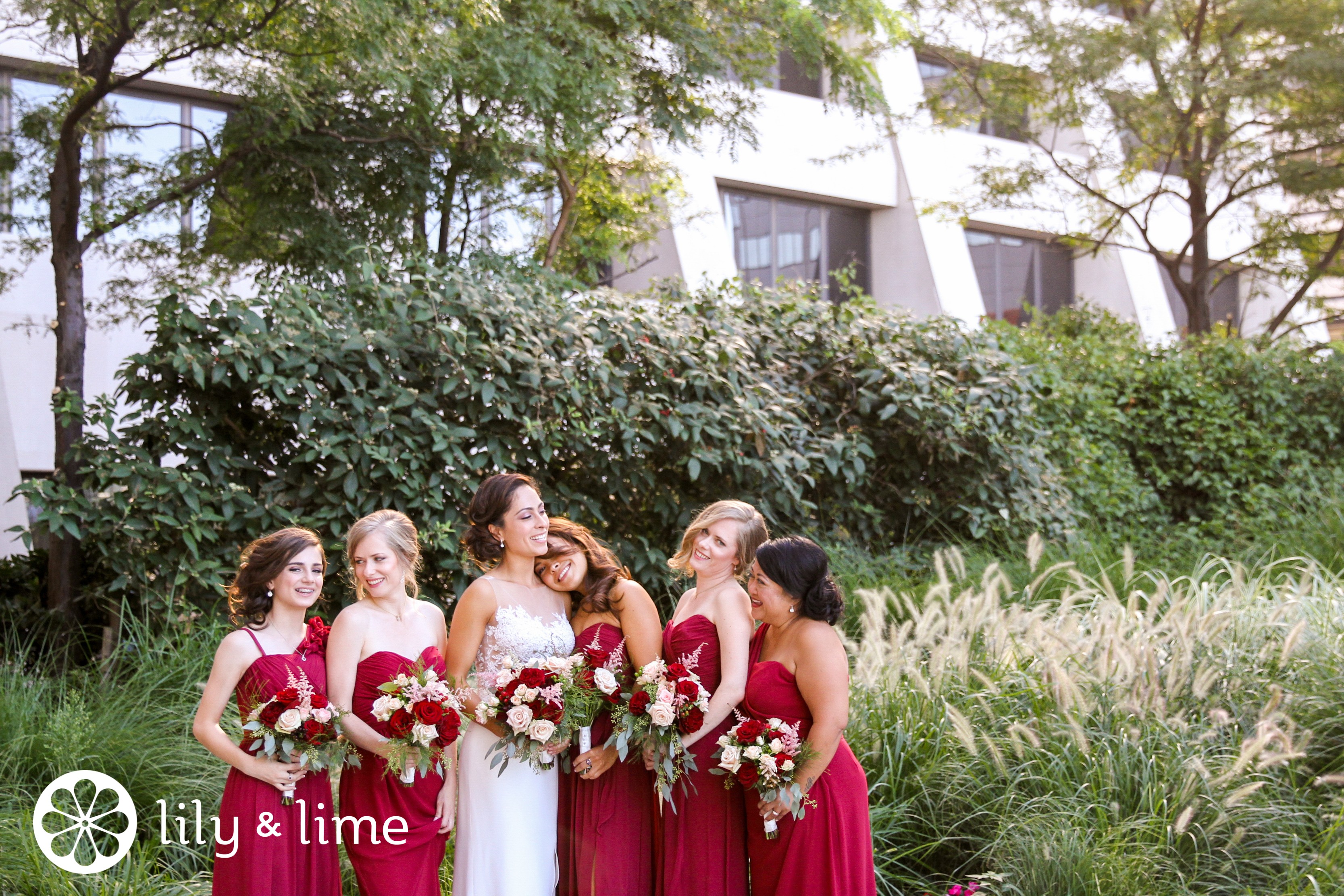 Deep red roses are vivid, dramatic, and gorgeous! Not to mention these crimson bridesmaid’s gowns:
