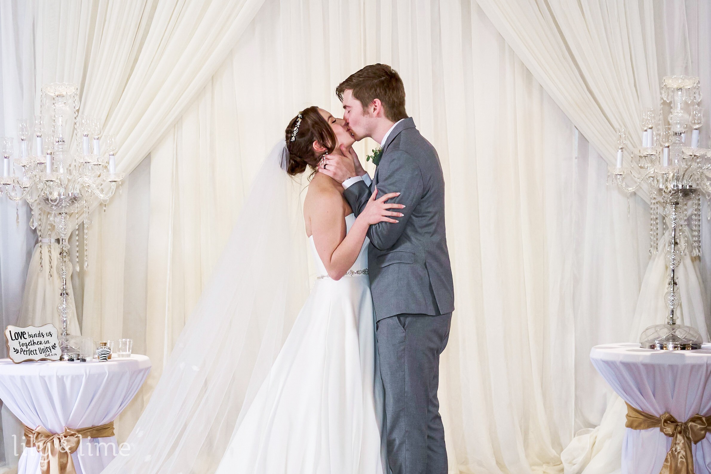 After the couple got ready for the day, which is potentially their most important day, it was soon time to meet for their no-look first look, beautifully captured by our Kansas City wedding photographers. The couple held hands and exchanged sentimental letters with each other, promising to meet again soon for their wedding ceremony. Soon, the couple's wedding ceremony commenced, and while John waited for his bride under the arbor, Allissa walked down the aisle with her father, and soon they said their vows to each other and sealed the deal with a kiss. They also performed a unity ceremony to commemorate the moment. After a dramatic shot of the groom kissing his new bride as they walked down their wedding recessional, it was now time for some formal wedding photography. The couple and the wedding party stepped outside for some stunning wedding photographs captured amidst the fall scenery by our Kansas City wedding photographer. The trees in the backdrop were changing color, and the dappled sunlight added an autumnal charm to the setting. After some gorgeous couple shots and group photographs, it was soon time for the couple to head back indoors to meet their guests and begin their wedding reception. The couple had their first dance, and the moment was skillfully captured by our wedding photographer in Kansas City. The couple then cut their cake, a simple three-tier rustic wedding cake with a gold cake topper. The wedding photographers also captured the sweet moments during the father-daughter and mother-son dances in some memorable shots. Meanwhile, Allissa sneaked out and changed into her after-party dress, a gorgeous black dress with lace details. The couple danced some more, and the wedding day came to an end as the happy couple walked out amidst a sparkler wedding exit. And just like that, a dreamy and romantic wedding day came to an end but will live on in our hearts forever.