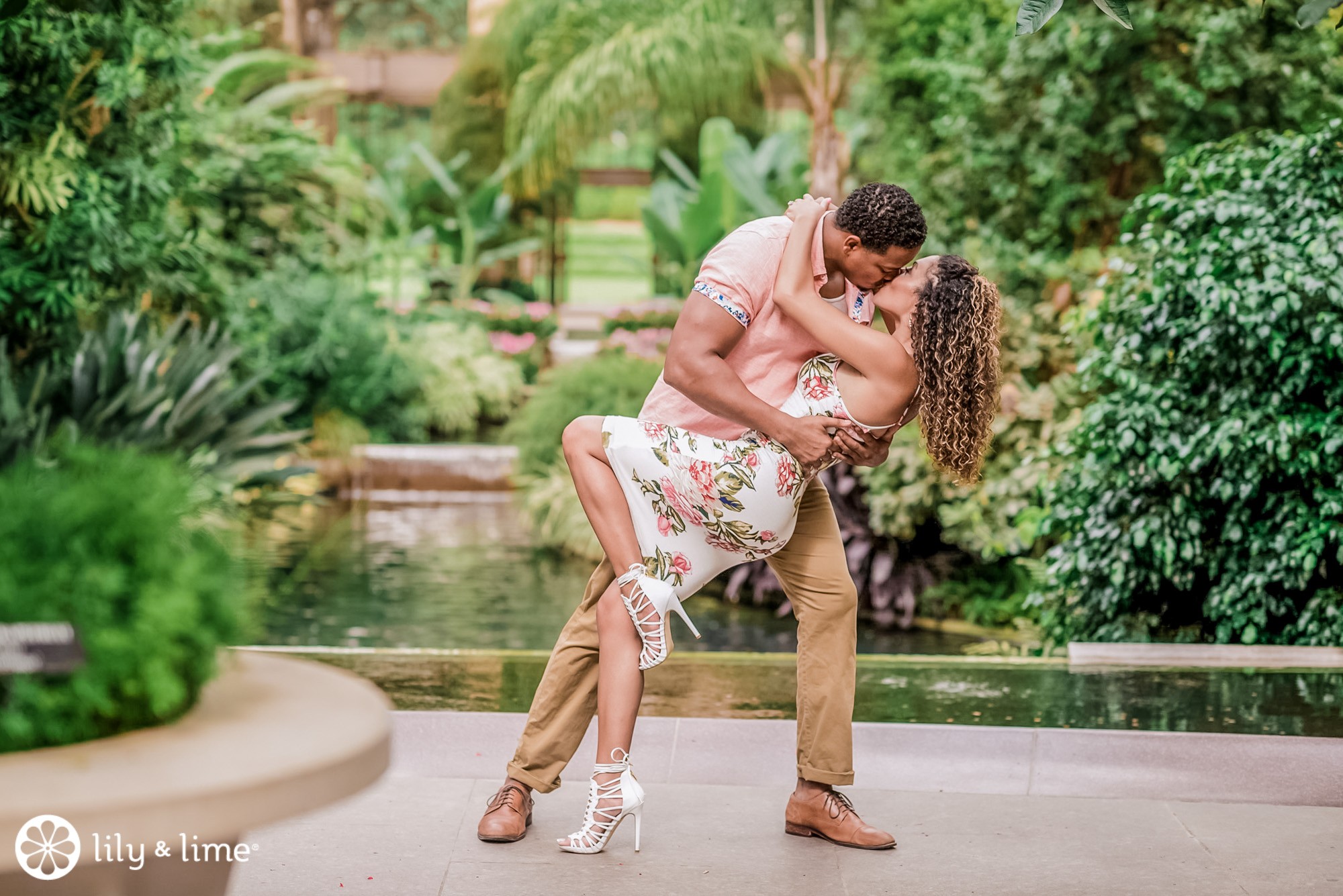 The Longwood Gardens engagement session began with Rebecca and Donnie posing alongside the lush gardens. Rebecca looked totally stunning in a white floral short dress and a white pair of heels. Donnie complemented her look in a pastel pink shirt and tan pants.