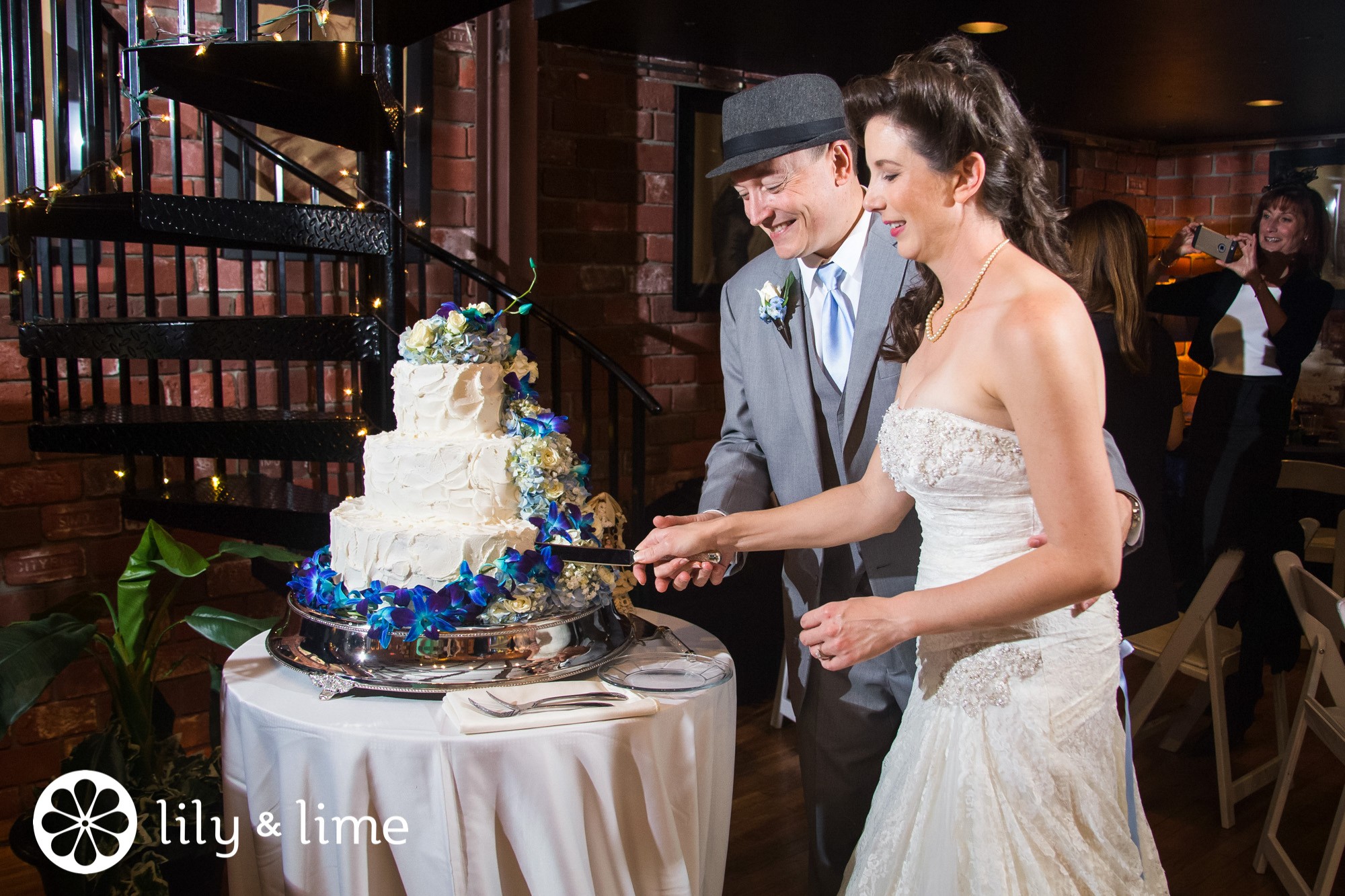 The venue brought a combination of Hollywood glamour and a speakeasy feel that highlighted the stylized bridal party looks. The bride and groom opted for a wedding color palette that incorporated different shades of blue. The ladies wore 50s-inspired mismatched bridesmaid dresses, tapping into one of the year’s top wedding trends.