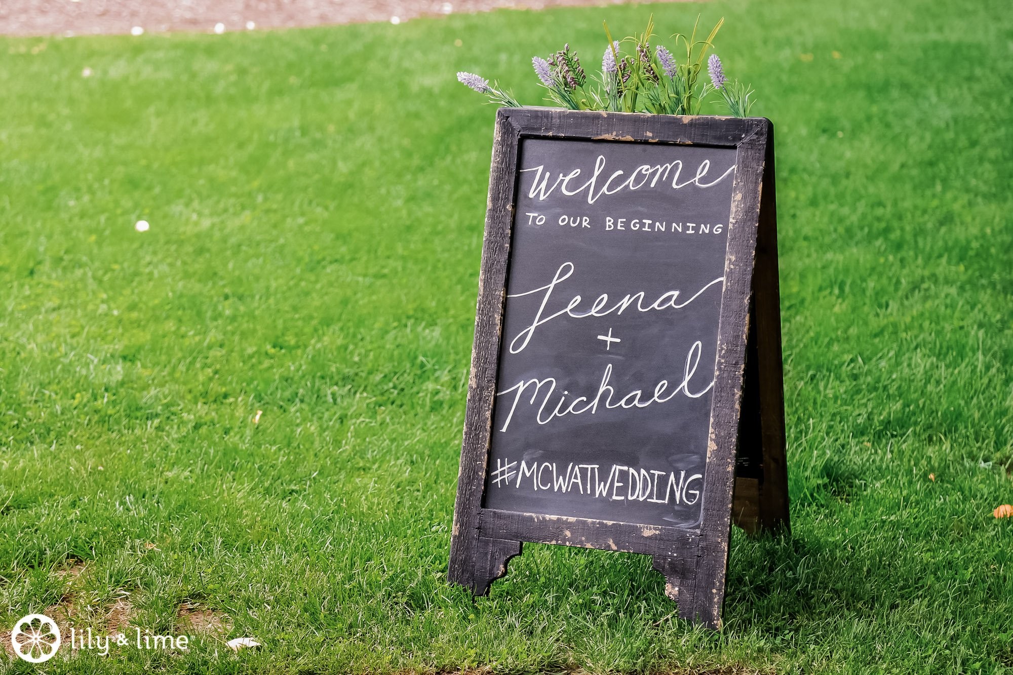 When planning what you want your wedding signs to be, keep a couple of things in mind. First, signs that pinpoint the itinerary are helpful for guests, as are signs that point them to the specific locations of the different events. Second, talk to your florist about your signage plans to see if they can create fitting arrangements to go with them.