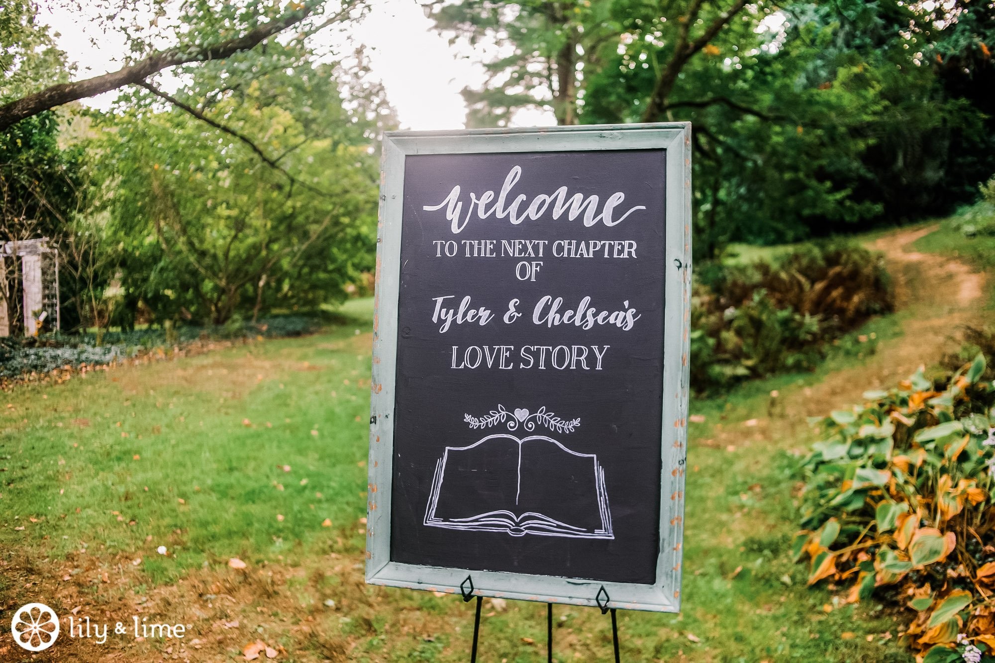 Ornate picture frames can add panache to your wedding signage, and they can be found for cheap at thrift stores. You can add an illustration that complements the text of the sign, or you can keep it simple with a succinct "Welcome."