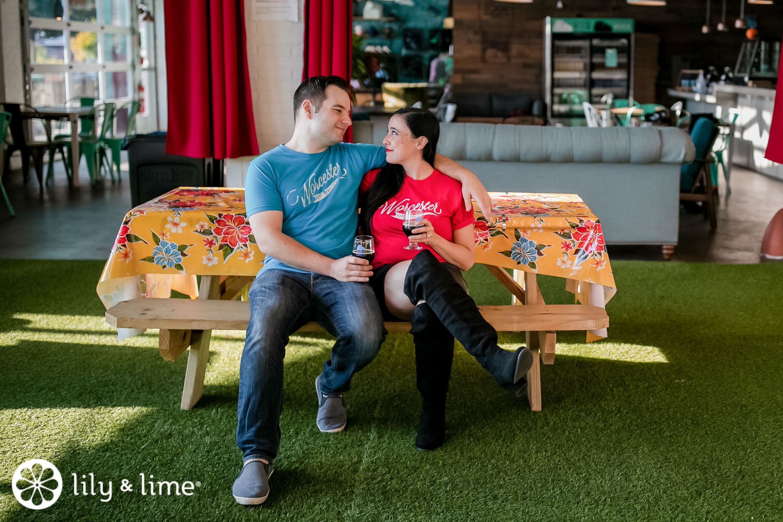 This love story was set in the city of Worcester in Massachusetts and every moment captured at these classic engagement locations in the suburbs of Boston had our hearts racing because of its sheer splendid atmosphere and fabulous backdrops. The seamlessly romantic vibe accompanied by vibrant backdrops at every step makes these some of the most favorite locations of our wedding photographers in Boston. Our hearts leaped with joy as the gorgeous Boston couple began their engagement photoshoot ata as this amazing city in the suburbs of Boston. They kickstarted their day by visiting Redemption Rock Brewing Company, Worcester, MA. It is a brewery, taproom, and cafe located in the pristine location of Worcester, MA. It opened its doors in January 2019 and was founded by a team of lifelong craft beer fanatics. With a goal of sharing beer fest experience along with delivering an opportunity to explore and have good times with friends and family, there is a strong sense of camaraderie and community. The vibrant backdrops of Redemption Rock Brewing Company ranged from gorgeous layouts with deep and colorful textures that shone as brightly as this couple's love story. Ranging from colorful table runners to bright and eccentric wall paintings, the textures of the amazing backdrops played a critical role in creating a fun atmosphere for this inspirational couple photography session in Boston.