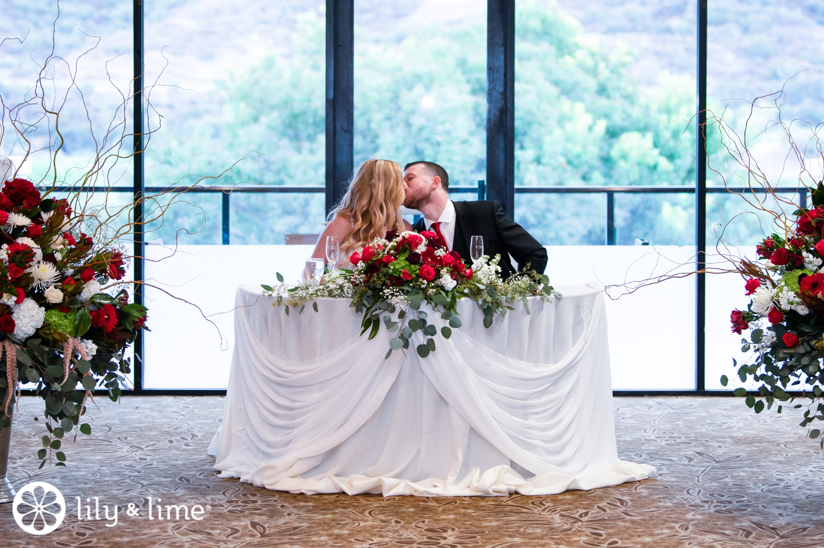 The gorgeous wedding centerpieces were gorgeously captured in detail shots that were made up of red white and green flowers as a nod to holiday wedding details. The ample use of green in all the wedding flowers looked ethereal especially at the onset of winter. The clean lines of the white table linens weaved a beautiful texture on every wedding portrait. The red green and white floral reception centerpieces popped gorgeously in every portrait against the white linens. Then the wedding photography journey took us to the thoughtfully placed little wedding details like the beautifully decorated corner table that was topped with two champagnes and sparkling champagne glasses with a monogram that said the letter 'K.'