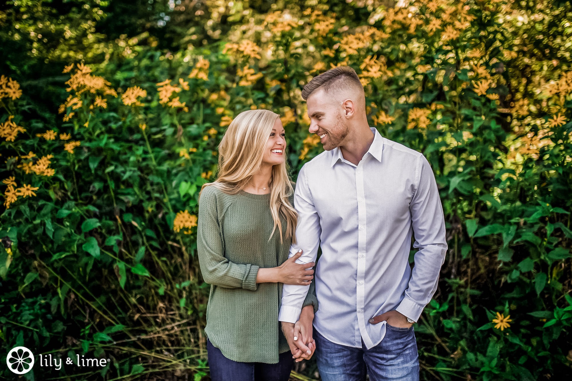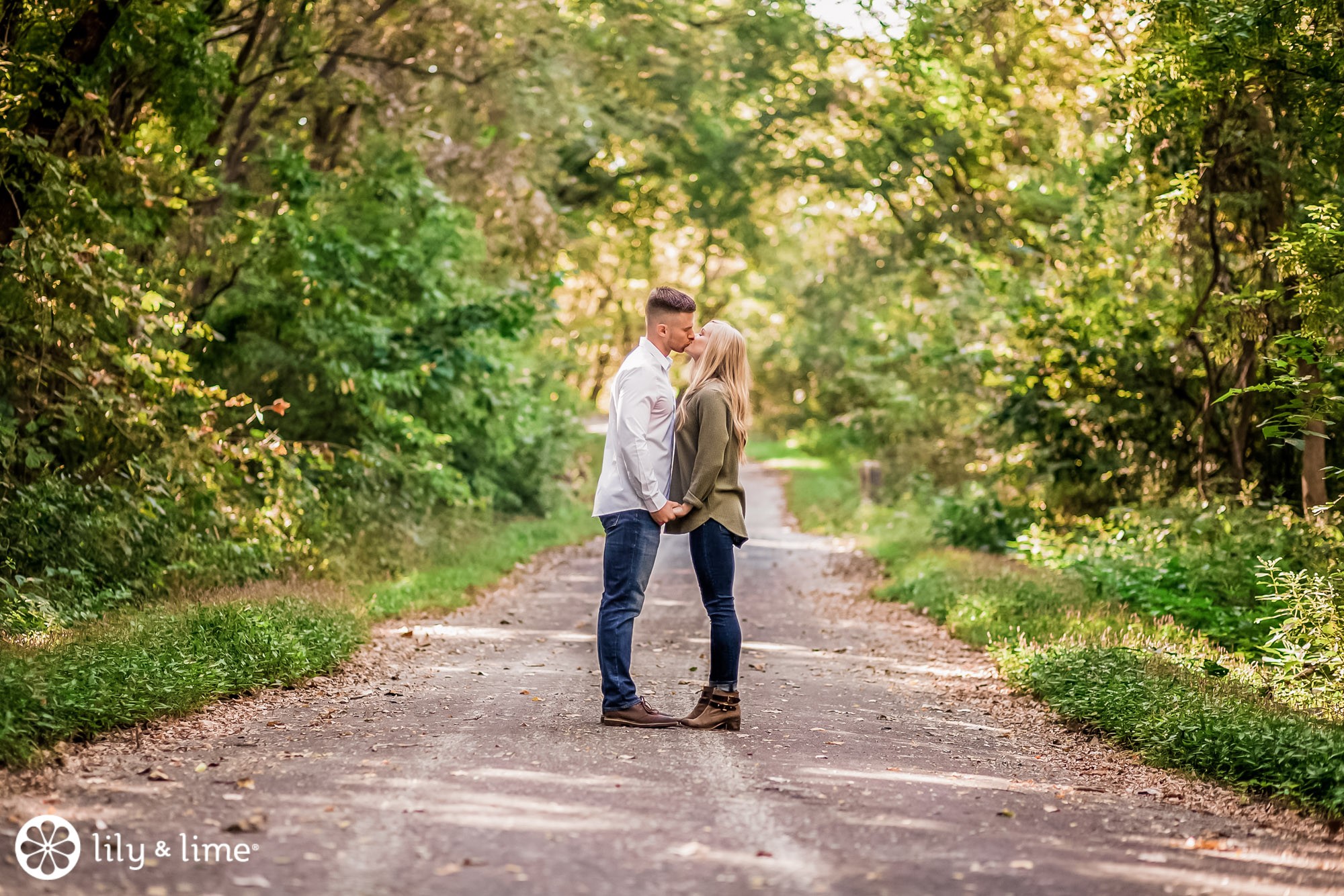 The couple slipped away to come back with a change in outfit, and the vibe instantly shifted to a more relaxed, woodsy one. Madison’s moss green top, blue jeans, and brown boots were a nod towards the earthy hues, while still staying true to her laid-back style. Tanner pulled a classic white shirt and blue jean ensemble, universally appealing, and something which brought in a lot of lightness to the photos. They looked deeply lost in each other when they posed along the rustic wooden fencing. The green bushes, with a riot of yellow blooms, added some cheer to the frames, and the boulevard of trees rendered the setting for Madison and Tanner to pose in adorable middle-of-the-road shots. We approve!
