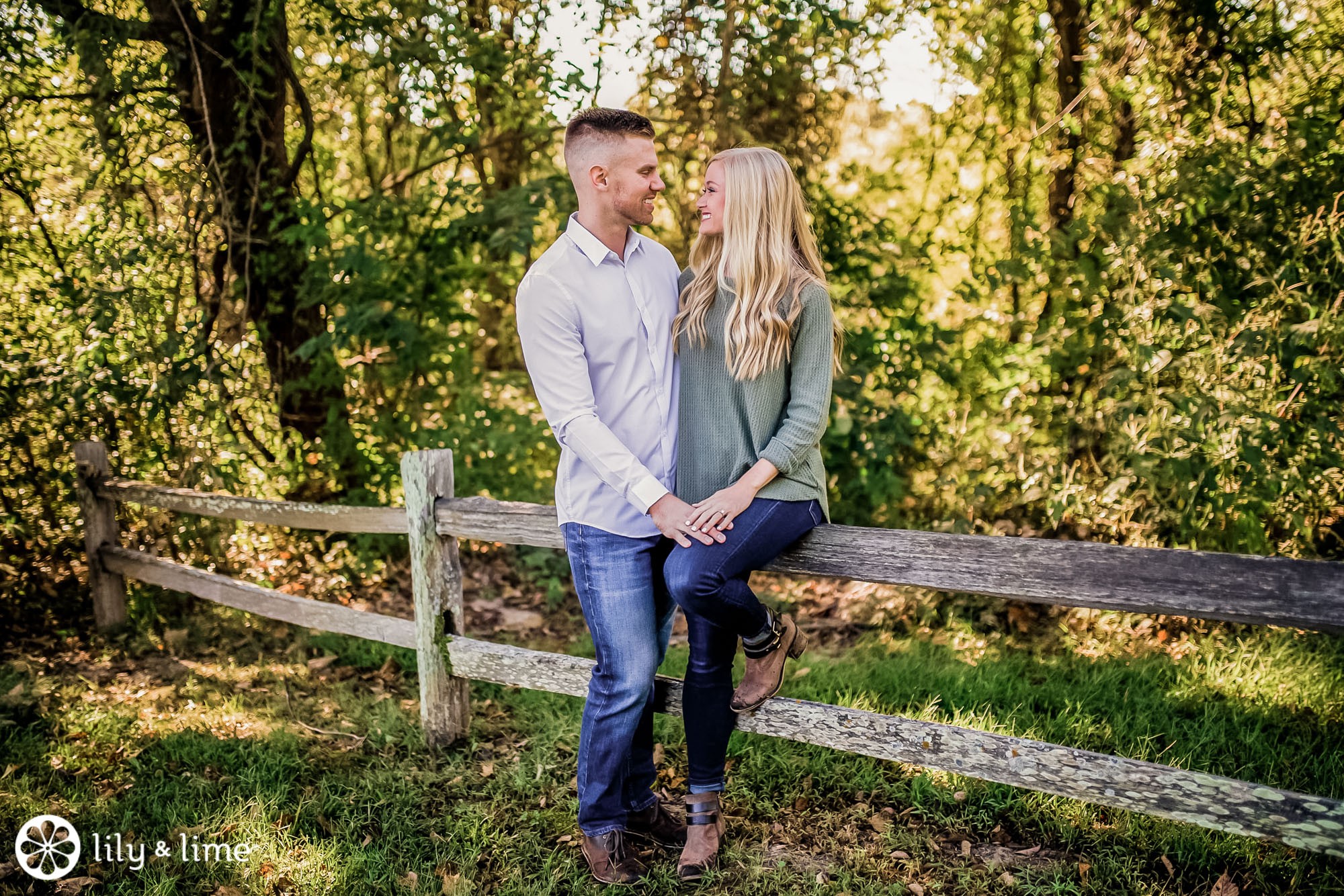We can’t stop raving about the beautifully minimal but rustic photos. Our favorite? The photos in front of the weather-worn wood exterior. There’s something about couples being photographed in the laps of natural wreck! Their Kansas City engagement photographer captured the duo in the little perfect nooks. The sunlight pouring in through the trees made them iridescent and added dimension to the photographs.