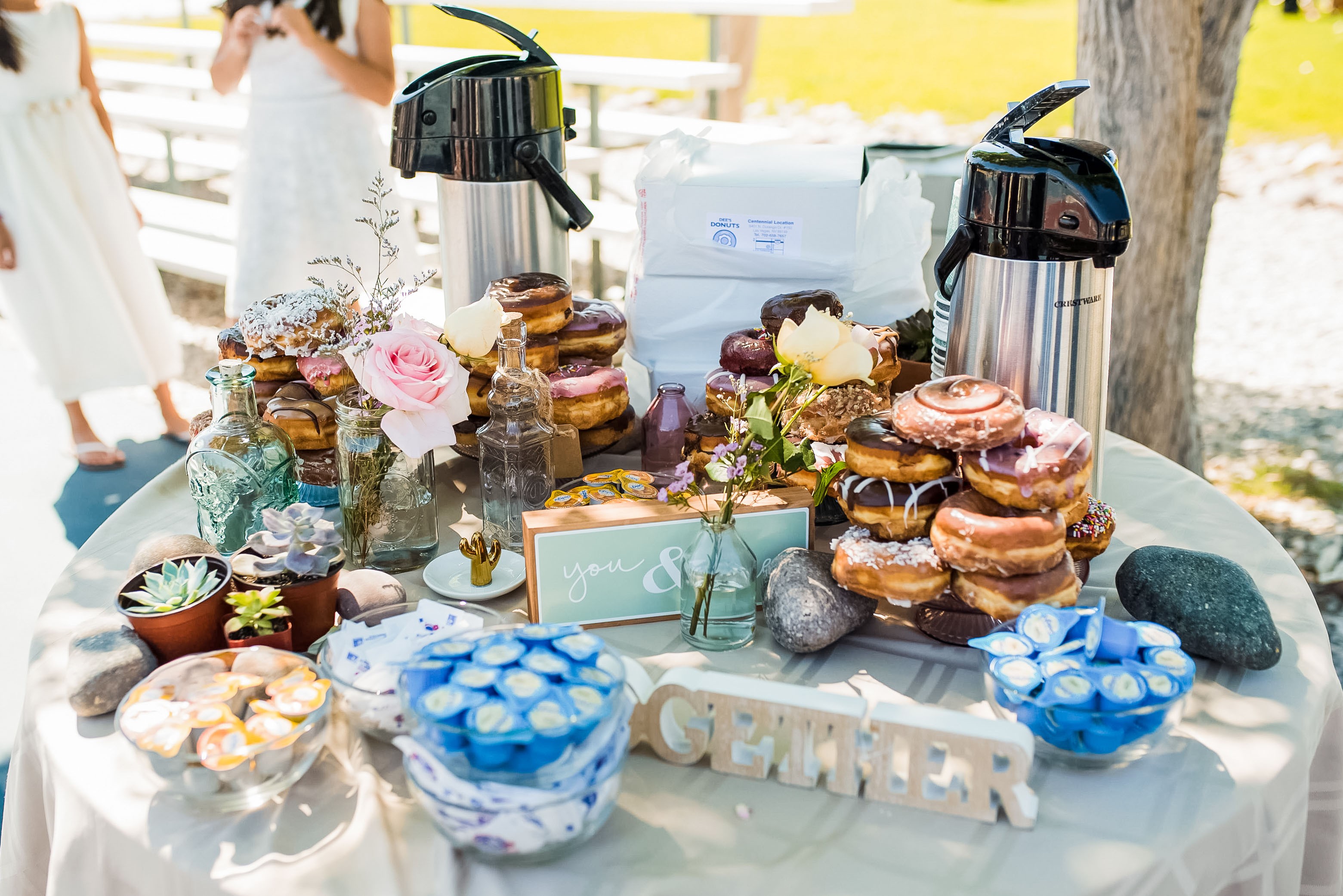 2. Turn your waffle bar into a gorgeous snack wonderland by surrounding all the waffle ingredients with a selection of fresh flowers, greenery, and candles in jars! Some gorgeous bouquets tied to the legs of the table can be a cut above the rest!