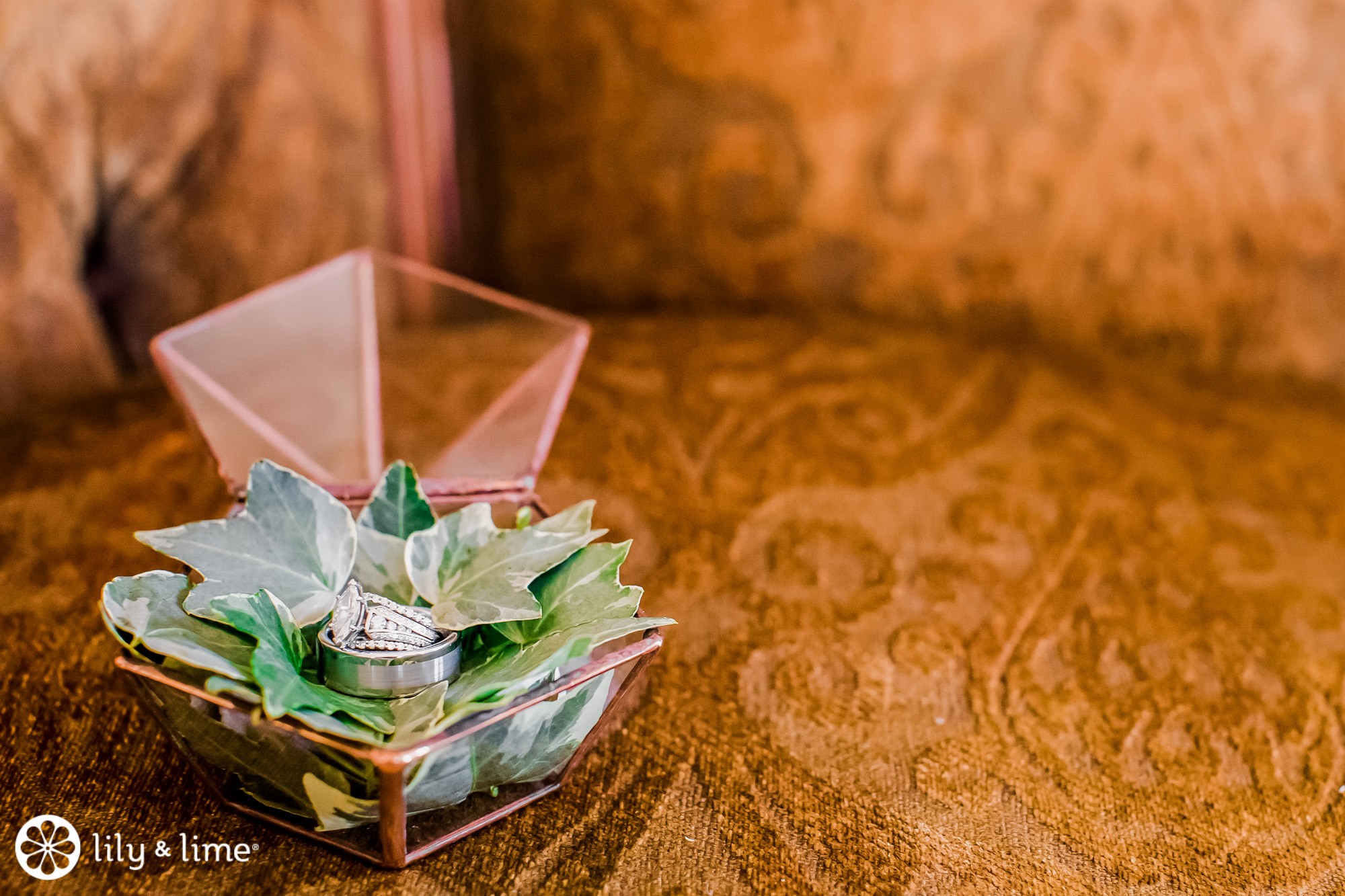 Glass boxes with metal detailing are the perfect home for a bed of greenery. The nature-loving couple will appreciate a vessel that brings a natural element. Try ivy, grasses, or moss. We love the greens paired with a glass box so that the rings and greens are safe but visible. This mini-terrarium is a sumptuous one-day home for your wedding rings.
