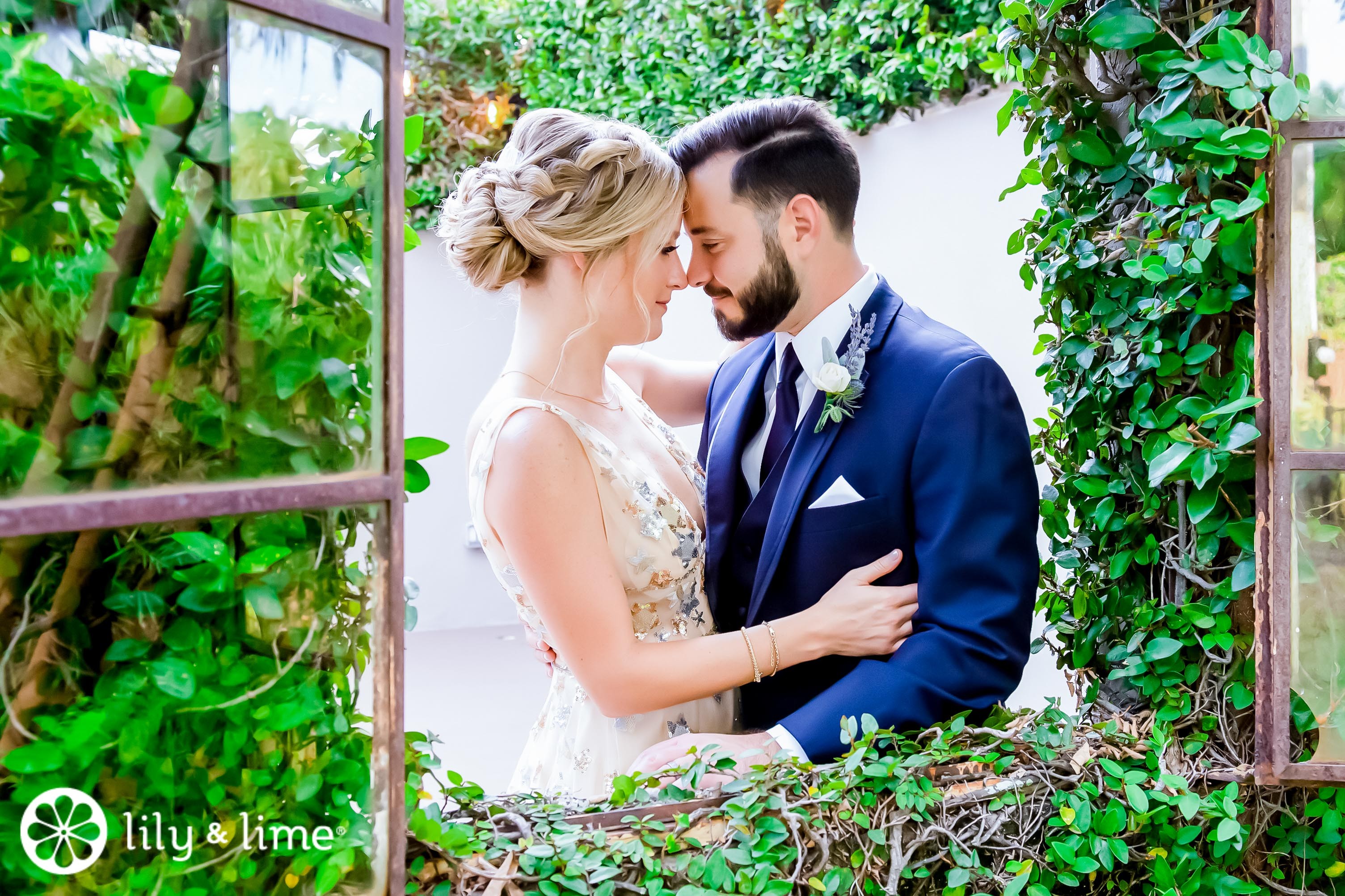 As the mesmerizing outdoor wedding ceremony came to an end, the bride and groom posed for some wedding photos, and the guests dispersed for the cocktail hour. Sloane and Kel loved minimal decor ideas, which is why their wedding had a similar vibe. The wedding decor details were minimal and were mostly nature-inspired. For the cocktail hour, the couple had chosen to greet their guests with beautiful signage, a baby blue signage with delicate, cursive letters, greeted all the wedding guests, which said, “Darling we’re all made of stars.” The illustrations on the signage matched the message perfectly as well. Furthermore, as the guests entered the venue, the guests were greeted with a water dispenser, a pretty one at that! The water dispenser was placed at the entrance to the cocktail hour venue, which had illustrations of fresh orange slices on it. To finish the decor of the entrance, the couple had specifically chosen a wonderful white flower-laden centerpiece complete with sprigs and bouquet fillers! As the guests enjoyed the cocktail hour, the adorable couple posed for some more wedding portraits! The two were energetic and full of different ideas for their wedding photoshoot! After clicking some photos with the groomsmen and bridesmaids, the two went back to their outdoor wedding ceremony location to get a photo clicked under the crescent moon decor! To make their photos perfect, the two kissed under the crescent moon, to create a timeless memory of the moment. Making use of the rustic beauty of a venue, the couple found different spots to click some amazing wedding photos! Through the woven grass walls and windows, to the rustic backdrop of an old door at the venue, The Acre Orlando offered an amazing look for the couple! Before their first dance at the reception party, the two quietly shuffled and slow danced when nobody was around, simply enjoying each other’s company! The idyllic ambiance of the venue added to the beauty of the venue and location, which made Sloane and Kel’s wedding photos dreamy. Trying out different poses, the two doted on each other and were full of brilliant smiles.