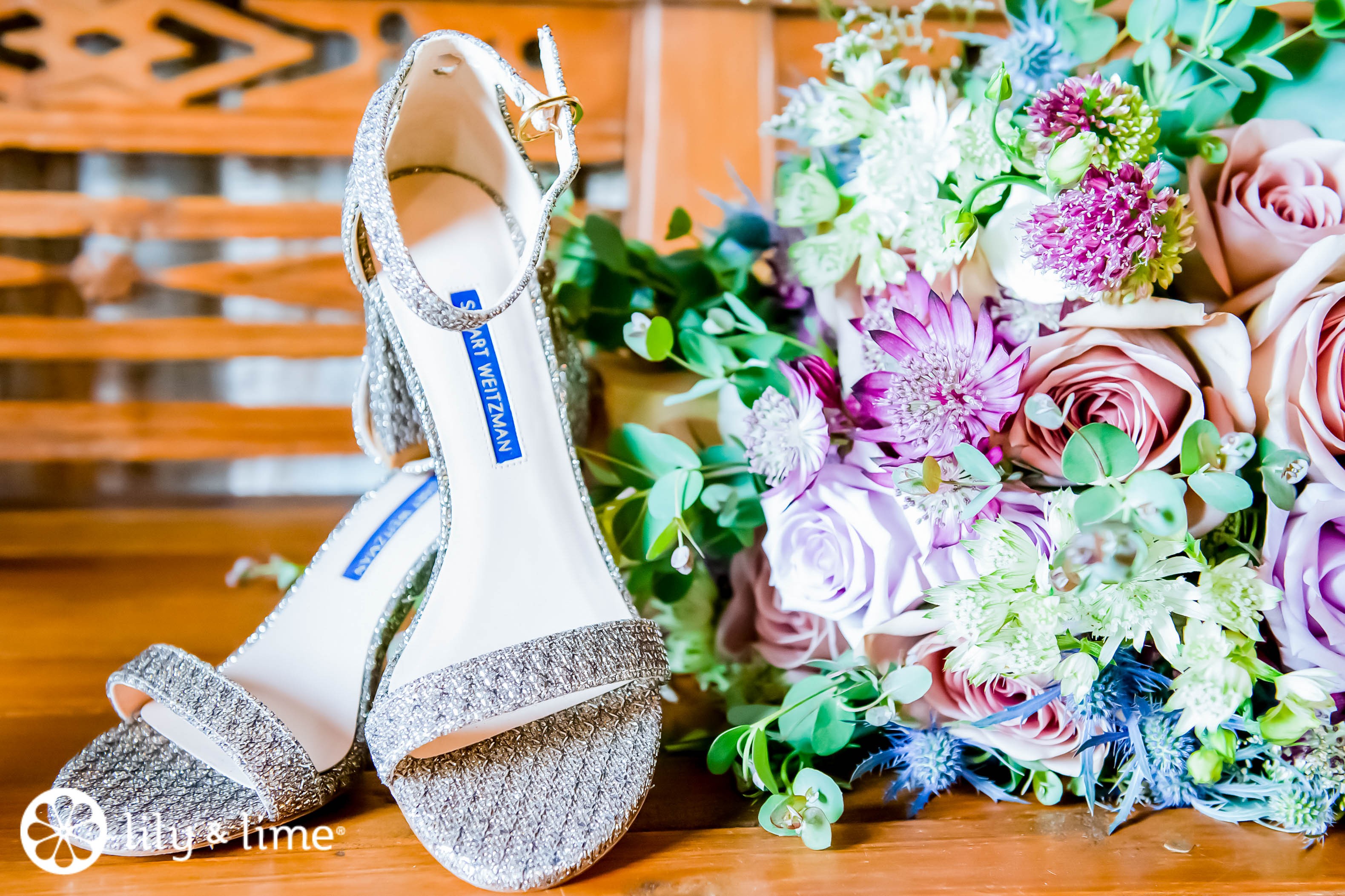 As for the bride and bridesmaids, emotions and excitement were running high for all of them. Before the bride and her bridesmaids began dressing up, our photographers took the opportunity to click some wedding detail photos. The dressing room was minimally decorated, much like the venue. The venue’s natural vibe was enough to add a charm to the couple’s wedding decor. As the bride entered the dressing room, she was greeted with a neat room with her muted silver heels placed next to her bridal bouquet and her bridal dress was delicately hanging on a hanger, waiting to be worn. The bride chose a beautiful sheath wedding dress in a muted peach shade, matching the lively outdoor setting of the wedding venue. The dress was incredibly detailed with beautiful tiny flowers. The floral wedding dress had a flared skirt, giving the dress a dreamy look. The bridesmaid dresses were slate gray, which went well with the chosen starry theme for the wedding. Considering the wedding theme, it is easy to see that the pretty peach dress made Sloane stand out, as the sun stands out in the sky, it is hard to believe that this detail was coincidental. When you see how much Kel adores his soulmate, it is easy to see that she is the sun in his life. Sloane completed her wedding day look with natural make-up and a delicate gold necklace. She truly looked wonderful. The last addition to her wedding look was the bouquet which was a beautifully tied bouquet of lovely bright flowers in the shades of peach, lavender, and blush pink. The bridesmaids carried a similar bouquet, sans the colored flowers. The bridesmaid's bouquets were hand-tied with large white flowers and cascading greenery. The bouquet fillers made the bridal bouquet look right at home in the rustic setting of the wedding venue. After she was done adding the last details to her wedding day look, she decided to get some photos with her mother and father. Her father was dressed in the colors the groom had dressed in, showing impeccable planning and coordination of the outfits for the wedding on the part of the couple. The mother of the bride was dressed in a dazzling white gown as well, which was simple and elegant. Another detail that we took note of was that the mother of the groom was also dressed in an elegant white dress. And both of these dresses were detailed with silver sequins, making both the mothers’ wedding day outfits coordinated!