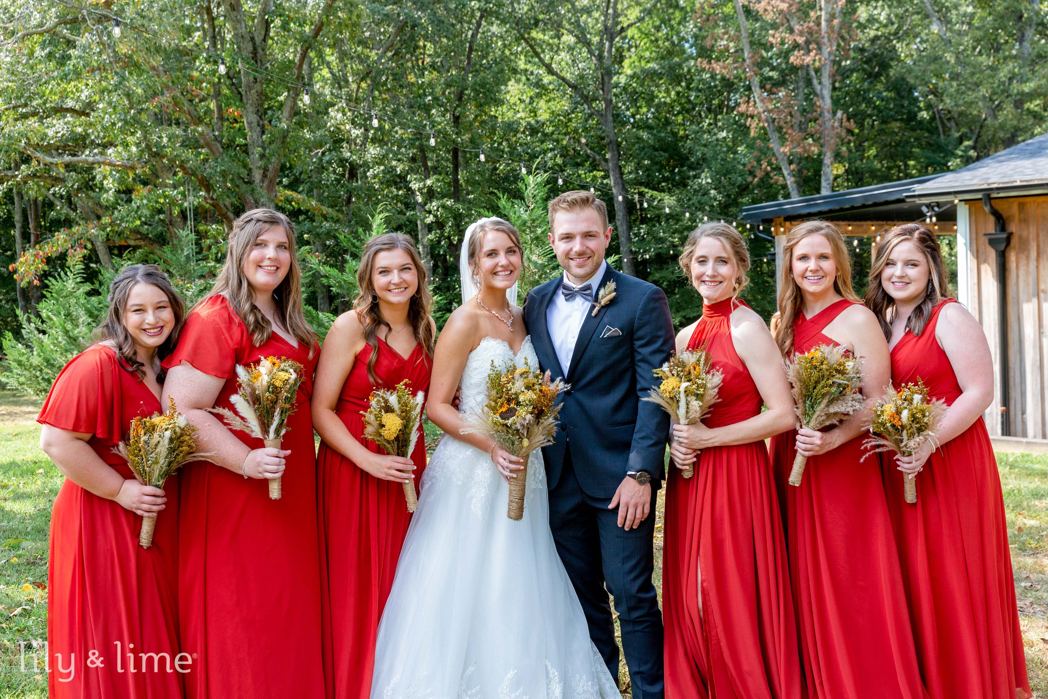 The group of bridesmaids and groomsmen looked equally gorgeous and stunning as they posed for a group photography session in an orchestrated way. Adhering to the fall wedding session, the gang of bridesmaids was dressed in red bridesmaid dresses in different silhouettes and carried matching bridesmaid bouquets. The groomsmen on the other hand orchestrated the entire wedding look by wearing exactly the same outfits as the groom. The wedding gang truly looked phenomenal while posing for group photography sessions in Nashville. From the wooden barrel details and pampas grass wedding décor to the lantern wedding ideas and wooden accents, everything came together to create a photogenic fall-themed wedding!